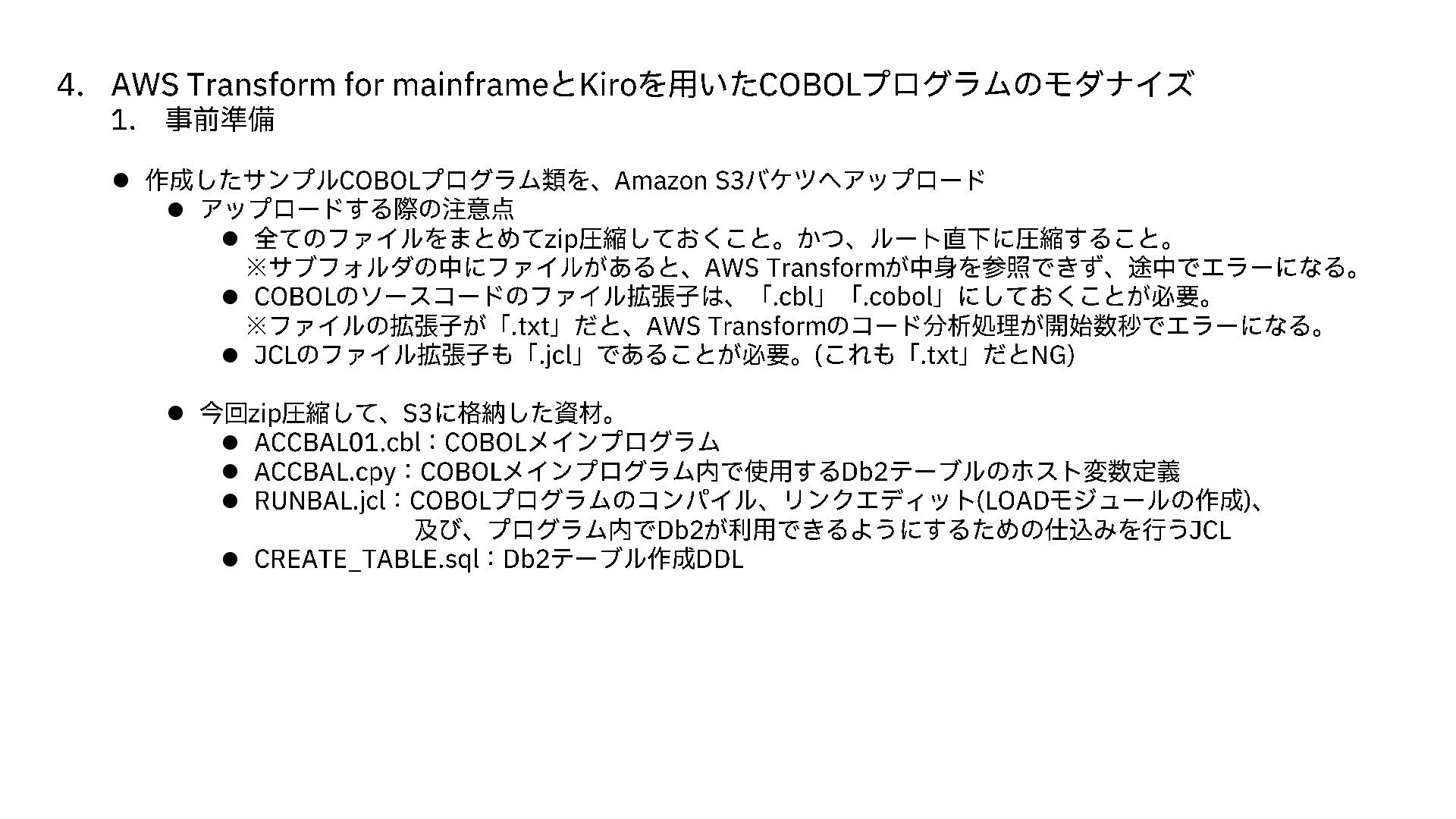 事前準備 ⚫ 作成したサンプル COBOLプログラム類を、 Amazon S3 バケツへアップロード ⚫ アップロードする際の注意点 ⚫ 全てのファイルをまとめて zip 圧縮しておくこと。かつ、ルート直下に圧縮すること。 ※サブフォルダの中にファイルがあると、 AWS Transform が中身を参照できず、途中でエラーになる。 ⚫ COBOLのソースコードのファイル拡張子は、「 .cbl 」「 .cobol 」にしておくことが必要。 ※ファイルの拡張子が「 .txt 」だと、 AWS Transform のコード分析処理が開始数秒でエラーになる。 ⚫ JCLのファイル拡張子も「 .jcl 」であることが必要。 (これも「 .txt 」だと NG) ⚫ 今回zip 圧縮して、 S3に格納した資材。 ⚫ ACCBAL01.cbl : COBOLメインプログラム ⚫ ACCBAL.cpy : COBOLメインプログラム内で使用する Db2 テーブルのホスト変数定義 ⚫ RUNBAL.jcl : COBOLプログラムのコンパイル、リンクエディット (LOAD モジュールの作成 )、 及び、プログラム内で Db2 が利用できるようにするための仕込みを行う JCL ⚫ CREATE_TABLE.sql : Db2 テーブル作成 DDL