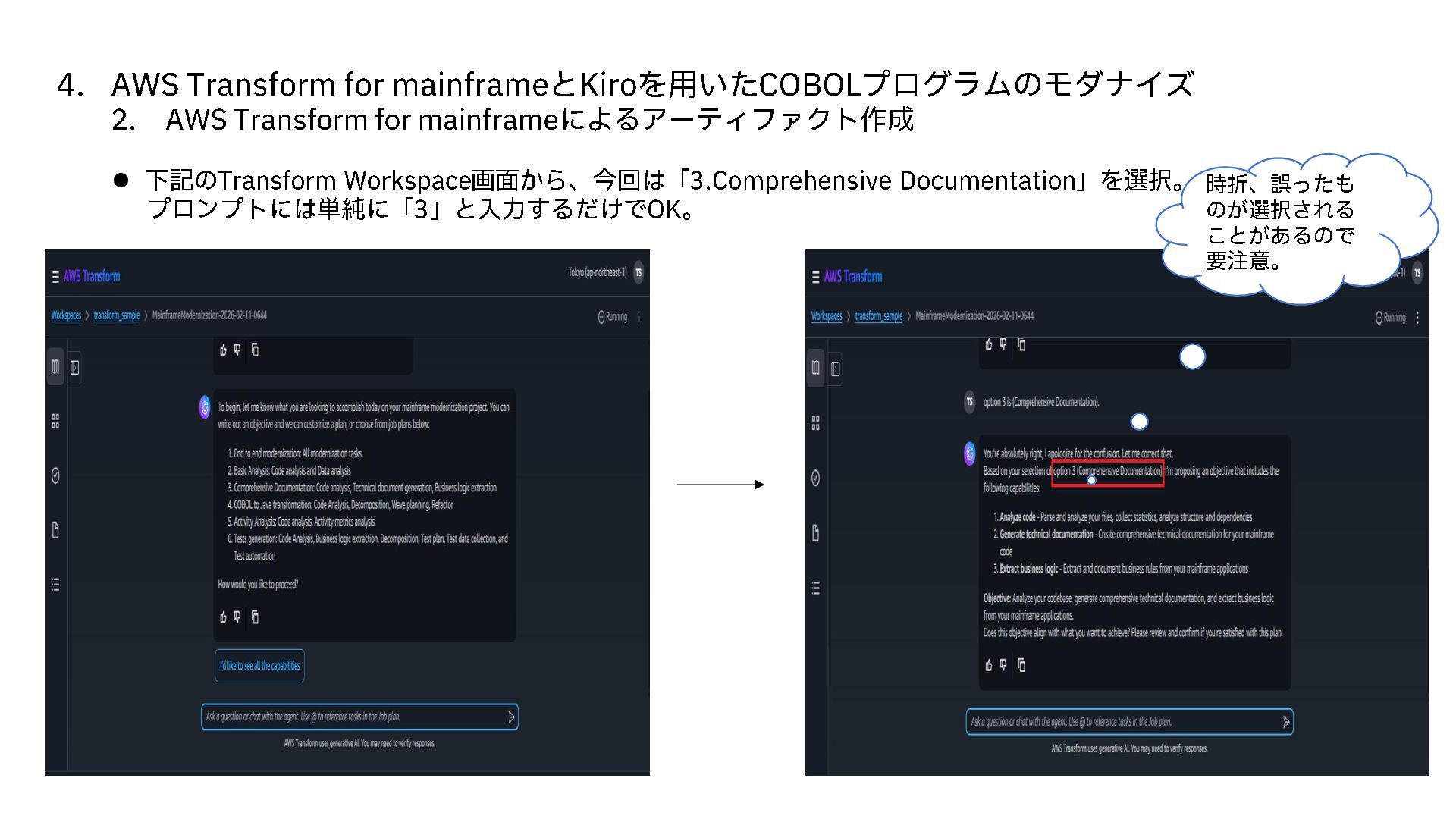 AWS Transform for mainframe によるアーティファクト作成 ⚫ 下記のTransform Workspace 画面から、今回は「 3.Comprehensive Documentation 」を選択。 プロンプトには単純に「 3」と入力するだけで OK。 時折、誤ったも のが選択される ことがあるので 要注意。