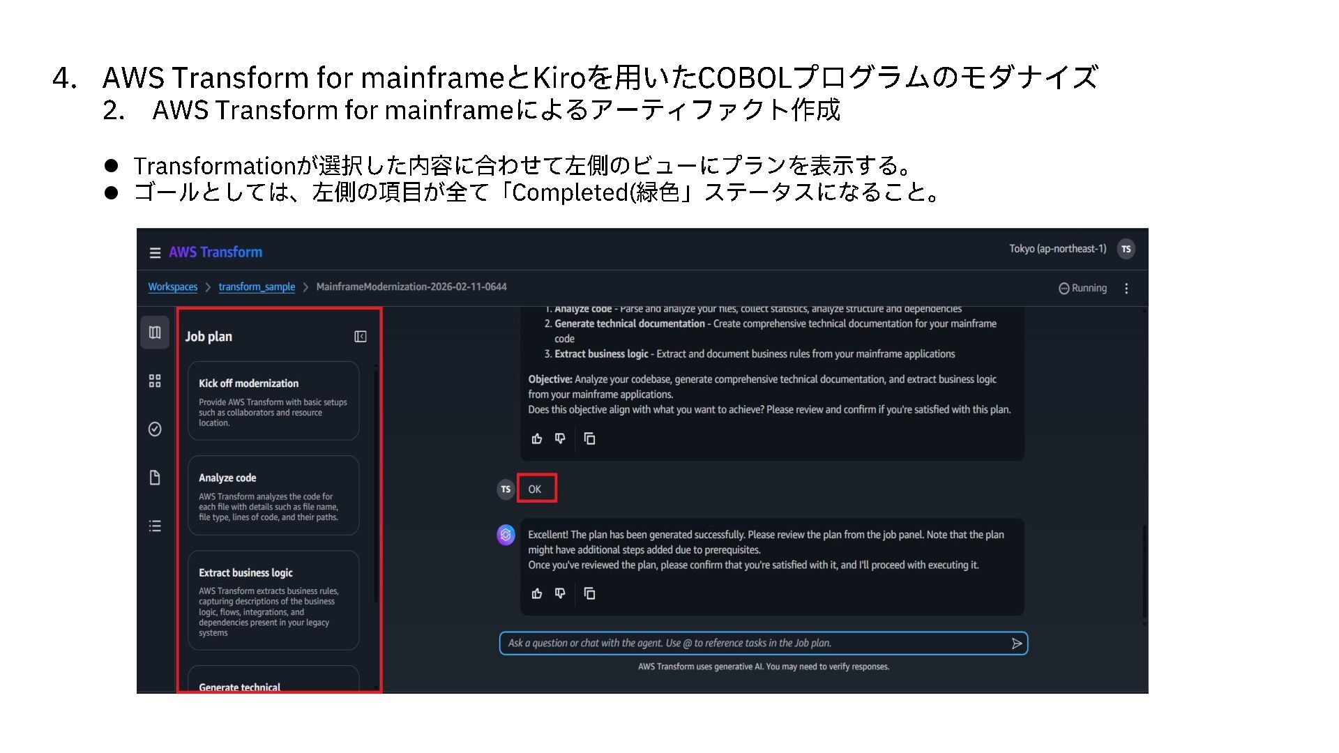 AWS Transform for mainframe によるアーティファクト作成 ⚫ Transformation が選択した内容に合わせて左側のビューにプランを表示する。 ⚫ ゴールとしては、左側の項目が全て「 Completed( 緑色」ステータスになること。