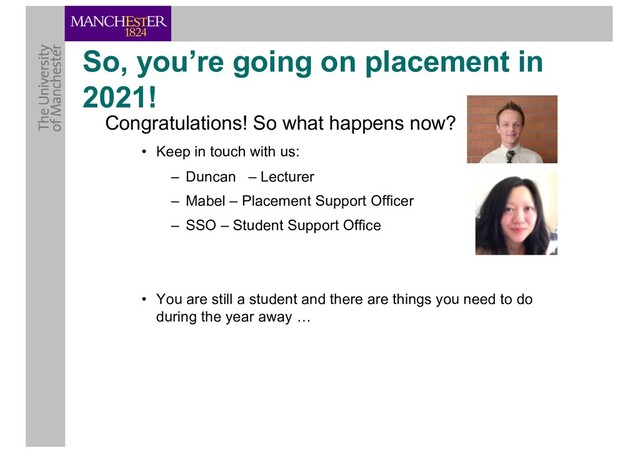 happens now? • Keep in touch with us: – Duncan – Lecturer – Mabel – Placement Support Officer – SSO – Student Support Office • You are still a student and there are things you need to do during the year away …