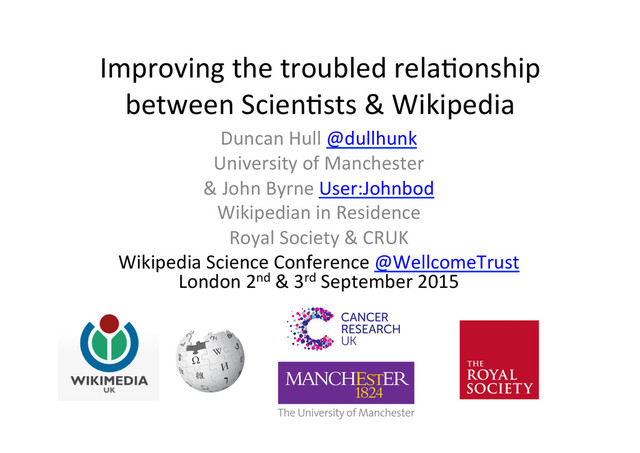 Duncan Hull @dullhunk University of Manchester & John Byrne User:Johnbod Wikipedian in Residence Royal Society & CRUK Wikipedia Science Conference @WellcomeTrust London 2nd & 3rd September 2015