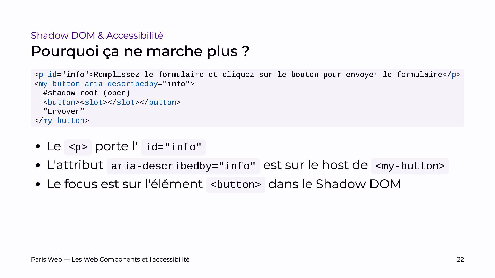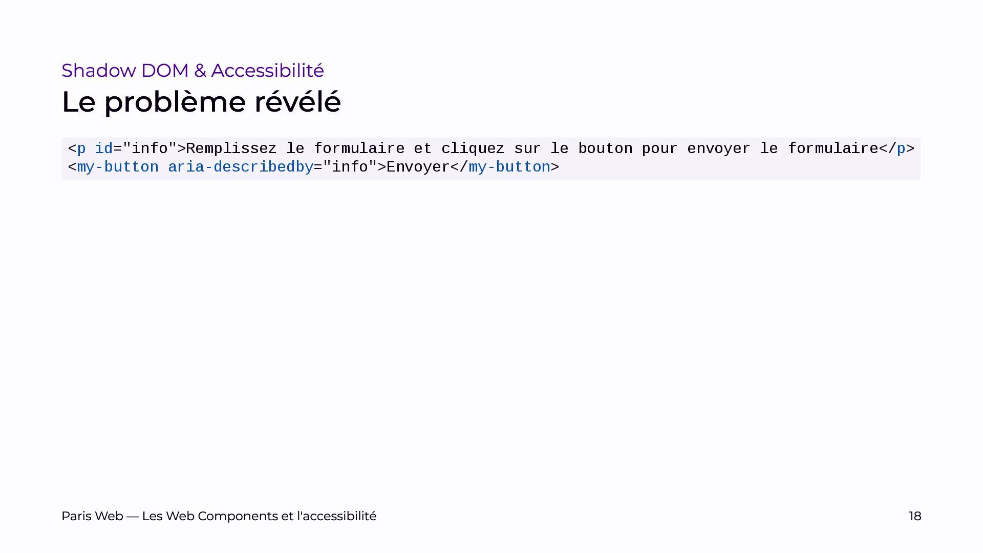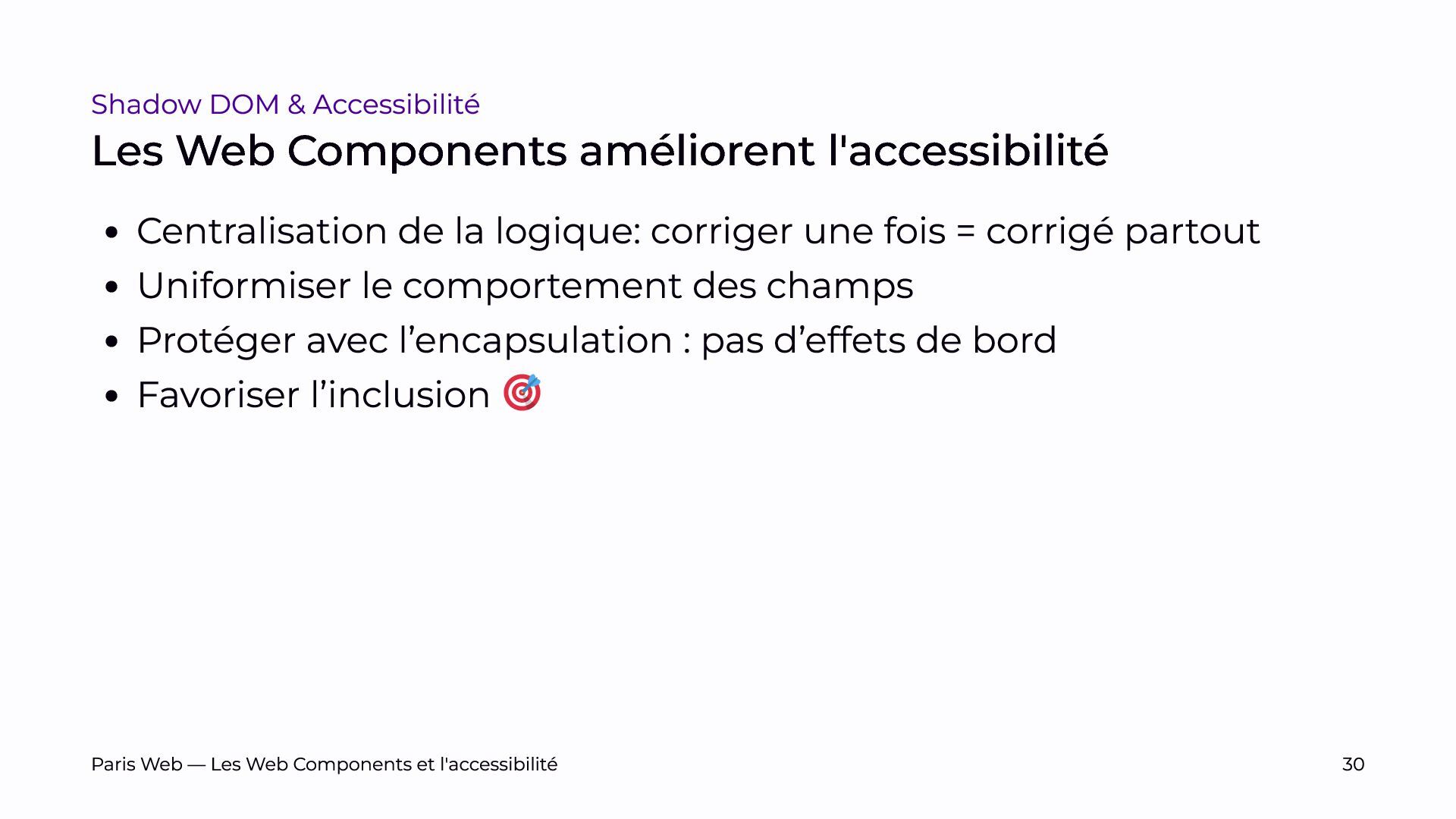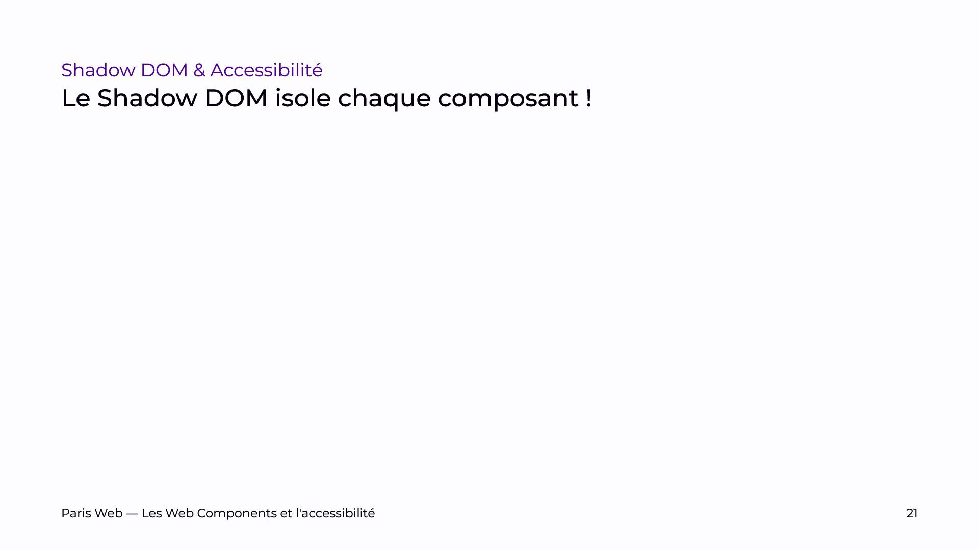 L’objectif est de sensibiliser les développeurs et développeuses, et les auditrices et auditeurs, aux enjeux spécifiques du Shadow DOM et de promouvoir des pratiques de développement plus inclusives.