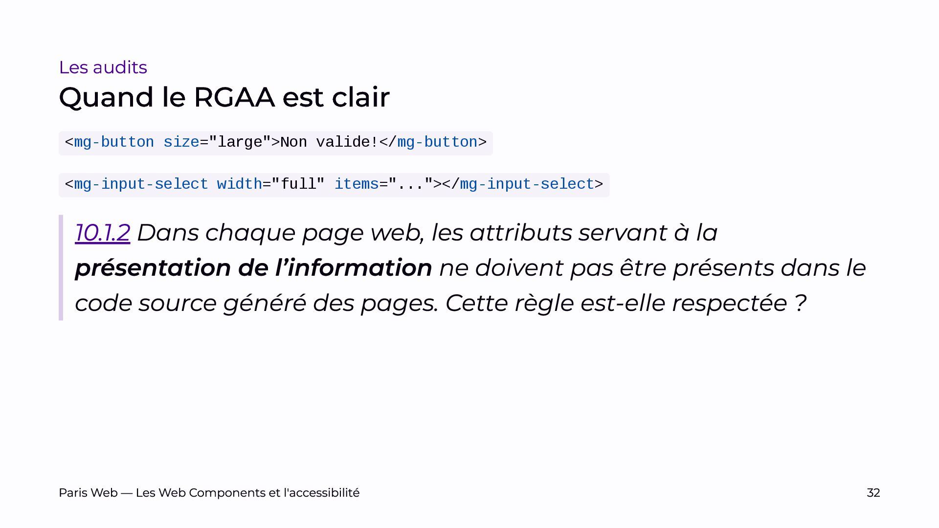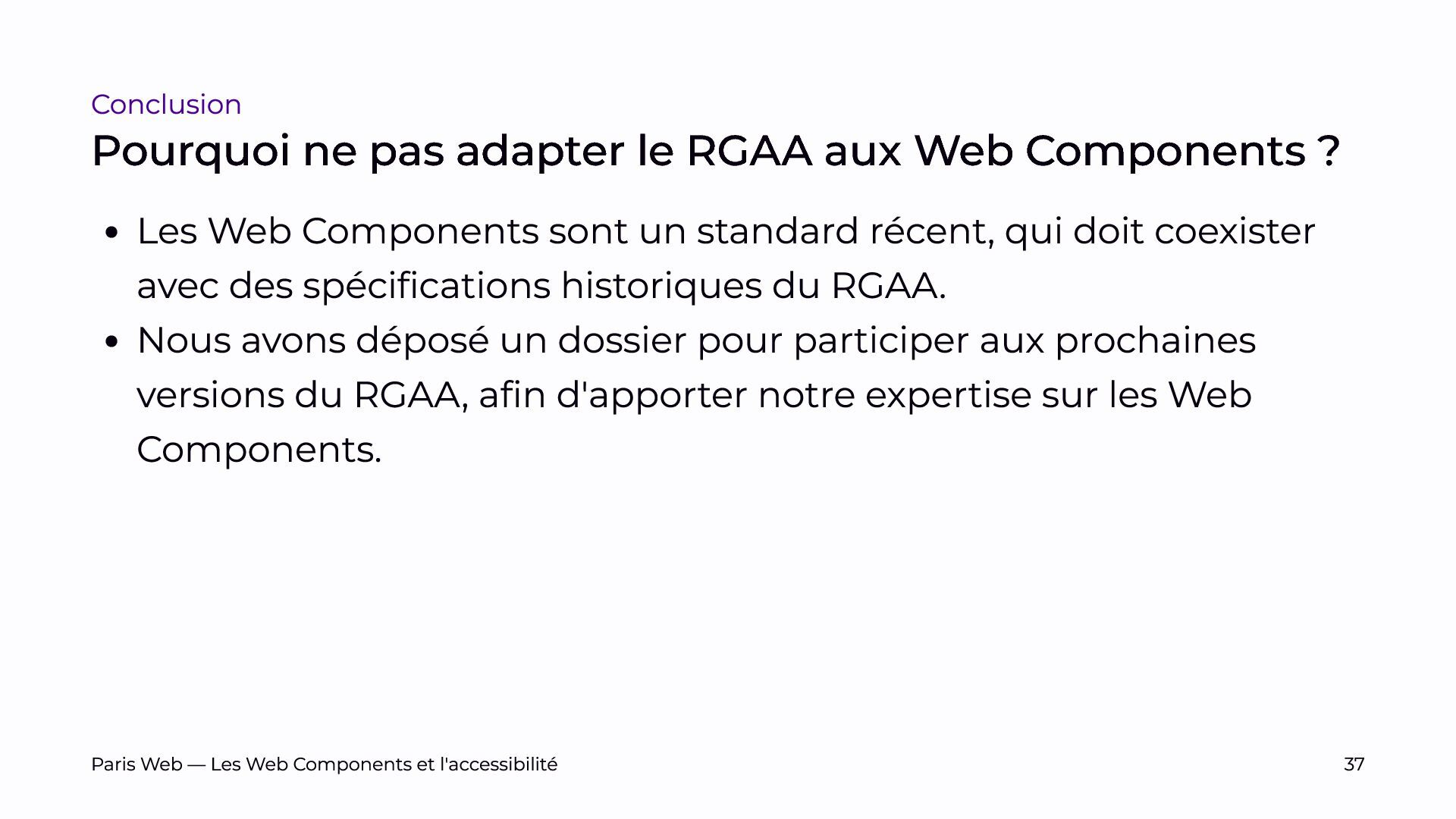 Nous discuterons également de l’application des critères de test du RGAA et des ajustements possibles pour mieux répondre aux besoins des nouvelles technologies. Nous avons d’ailleurs déposé un dossier de pré-inscription pour participer aux travaux d’évolution du RGAA, afin de contribuer activement à l’amélioration de ce standard.