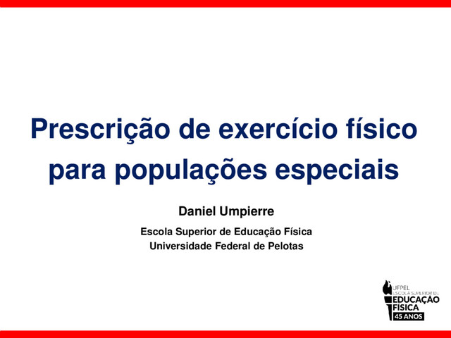 Talk of nearly 40min delivered at the National Symposium of Physical Education 2016 (Pelotas, Brazil). Key topics include disease prevention by physical activity and relevant factors for exercise prescription in diabetics, hypertensives, and cardiac patients.