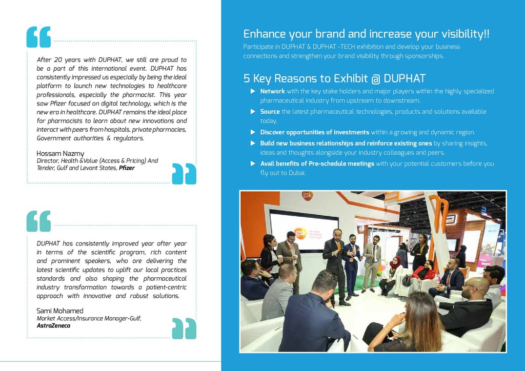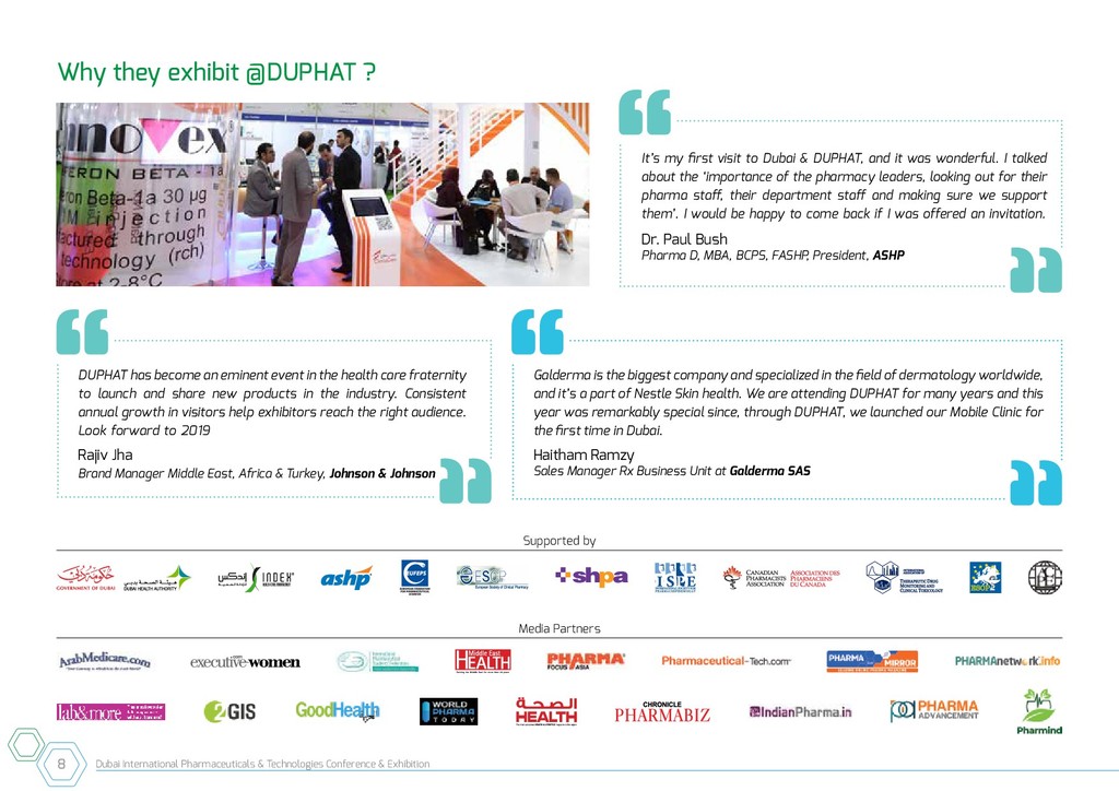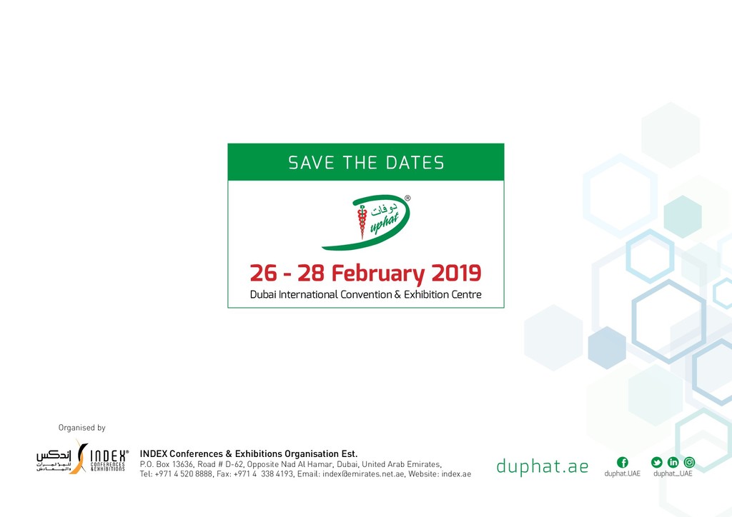of the world is undergoing substantial transformation towards greater automation, robotics, specialization and importantly upgradation of quality services. For pharmacy to keep in pace with the rest of the world it is most critical to realign, reengineer and reinvent our approach in order to be an integral part of the healthcare fraternity. Therefore, it is of paramount importance that the focus should be on enhancing and upgrading competency and professionalism, facilitating staff development, introducing new range of specialized services apart, benchmarking and pursuing global collaboration. DUPHAT has evolved from its nascent years in the mid-90s to a full-fledged comprehensive and internationally recognized pharmaceutical conference. The International patrons and professionals have contributed significantly to DUPHAT’s stature and presence in the global scenario. The regional associations and experts have always participated in DUPHAT conferences with increasing enthusiasm. The constant support of Dubai Health Authority has significantly helped DUPHAT emerge as the premier conference in the region. DUPHAT 2019 shall feature distinguished pharmacy professionals from all over the world. Speakers from USA, UK, Australia, Europe, Canada, Africa, Japan and the Middle East shall present their latest perspectives on pharmaceutical science in the intensive 3–day program with a wide variety of topics encompassing pharmacy practice, pharmaceutical science, quality and safety of medicines, medication management, drug recalls and shortages, governance, education, continuing professional development and best practices. DUPHAT scientific program comprises Pharmacy Workshops, Managerial skills workshop, parallel scientific presentations, professional faculty and student poster session, student poster competition and student short oral presentation competitions. The latest technical information from the pharmaceutical industry will be highlighted in the Pharmaceutical Technologies Exhibition which hosts multinational pharmaceutical companies from the region. As in the previous editions, schools from Dubai are participating with healthcare exhibits and cultural activities. DUPHAT is a conference that aspires to be the most sought after global event for pharmacists, professionals from the pharmaceutical-industry, marketing professionals, researchers, academics, scientists, clinicians, students and other healthcare professionals. Looking forward for your presence at DUPHAT 2019, Dr. Ali Al Sayed Hussain MS, Ph.D. DUPHAT Chairman