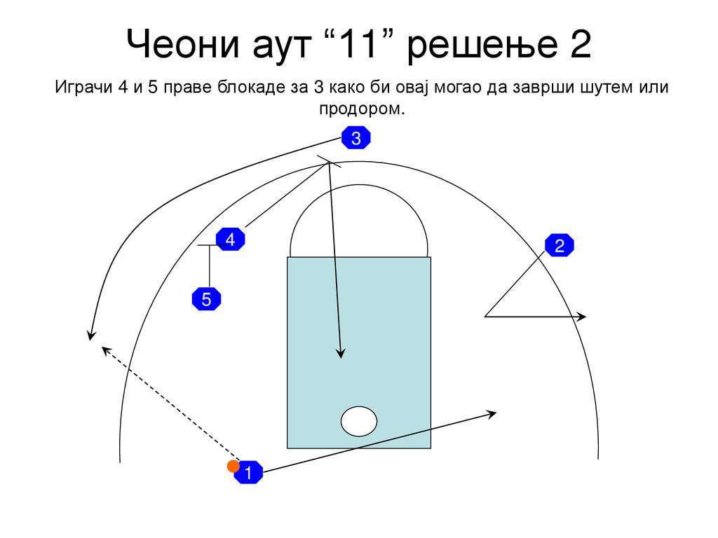 Играчи 4 и 5 праве блокаде за 3 како би пажња одбране била на овом играчу. 4 након блокаде утрчава ка кошу добија лопту и поентира!