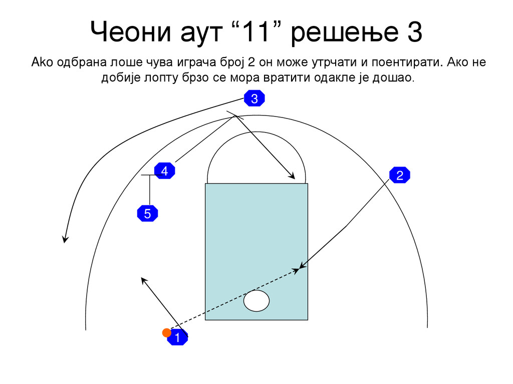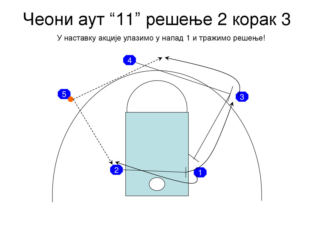 4 3 Ако 3 не успе да поентира покушава да дода играчу број 5 који утрчава након леђне блокаде. Ако то не успе лопту додајемо 4 и настављамо кретњу.