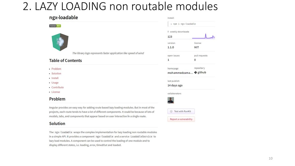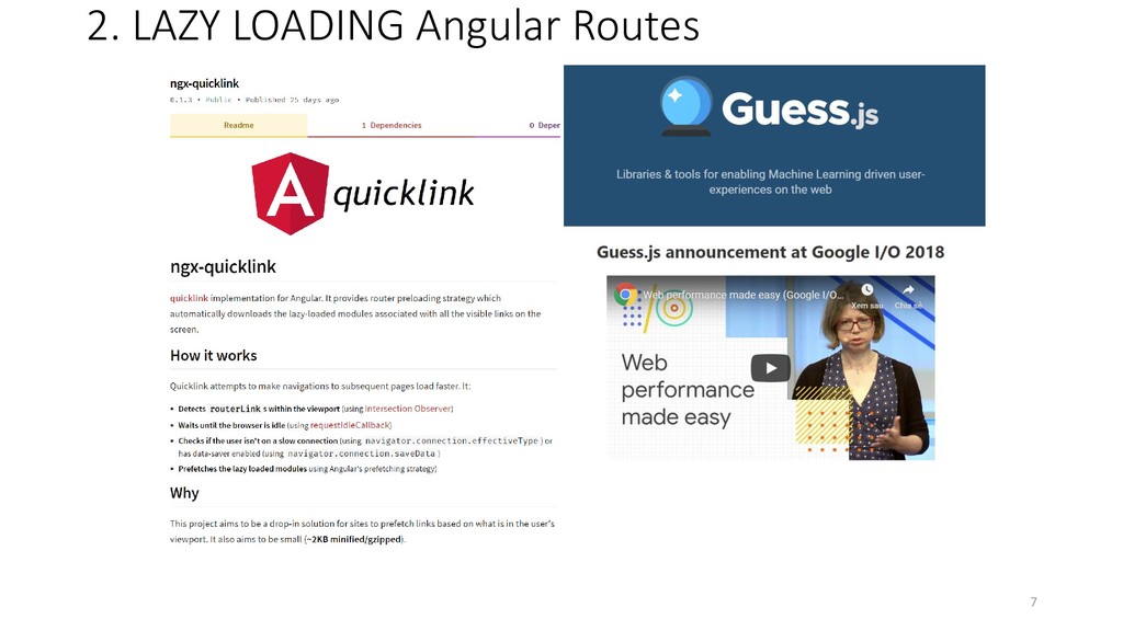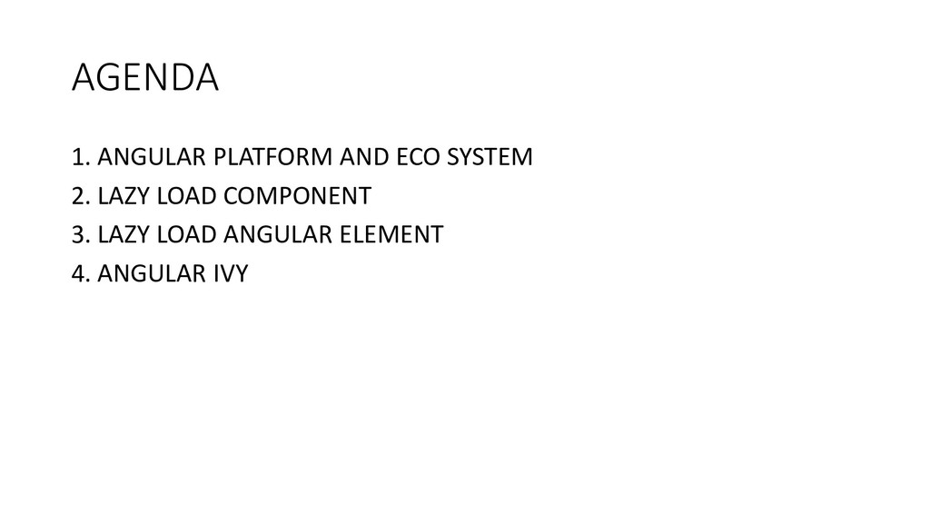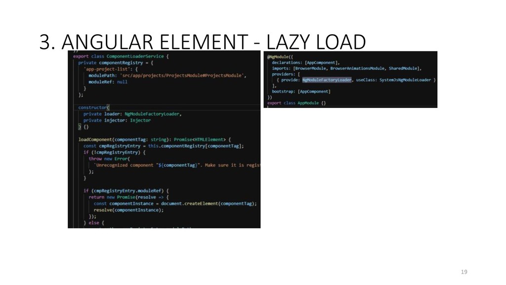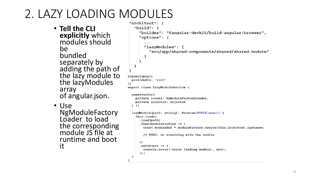 modules should be bundled separately by adding the path of the lazy module to the lazyModules array of angular.json. • Use NgModuleFactory Loader to load the corresponding module JS file at runtime and boot it 8