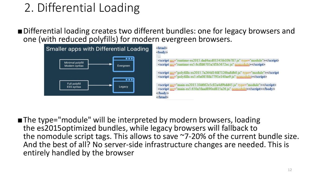 for legacy browsers and one (with reduced polyfills) for modern evergreen browsers. ▪The type="module" will be interpreted by modern browsers, loading the es2015optimized bundles, while legacy browsers will fallback to the nomodule script tags. This allows to save ~7-20% of the current bundle size. And the best of all? No server-side infrastructure changes are needed. This is entirely handled by the browser 12