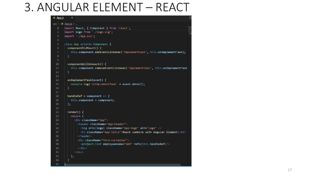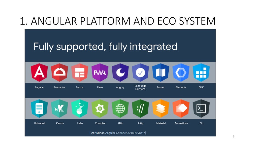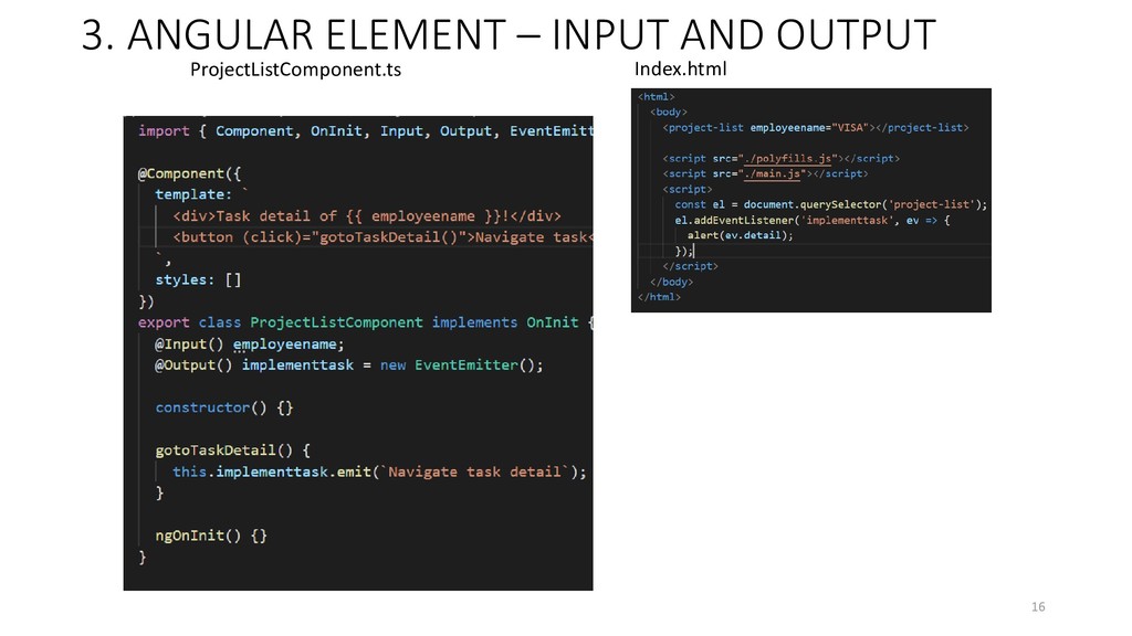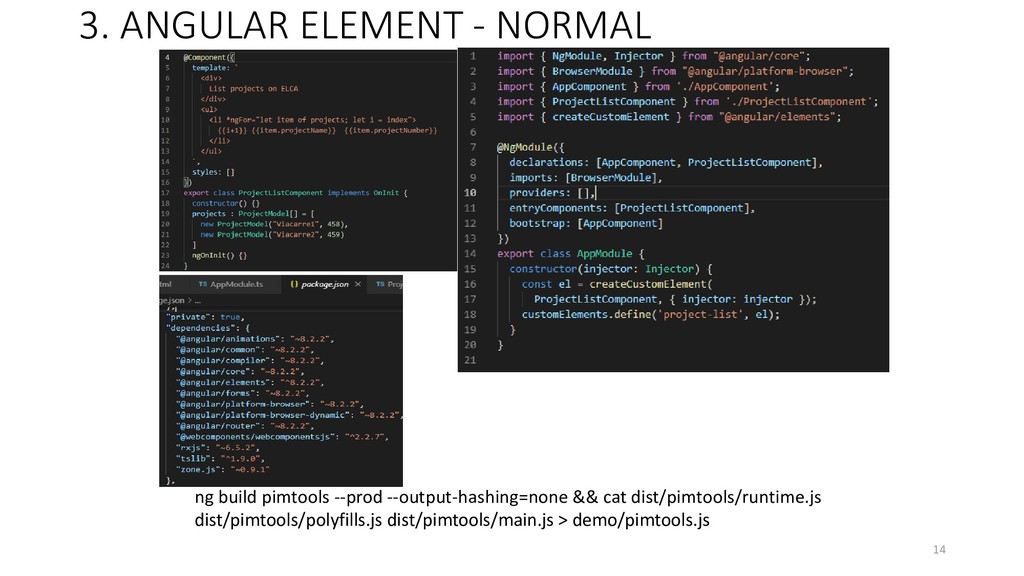 custom elements from Angular components (web component) ▪Expose as web component so that you can use them everywhere every framework (i.e. expose custom elements) ▪To make it work with legacy browser, we must to install the polyfill. One of these polyfill which come from Polymer project from google ▪Angular Elements are not just about compiling them into standalone JS files to be used outside of Angular but also use for dynamically loading components. 13