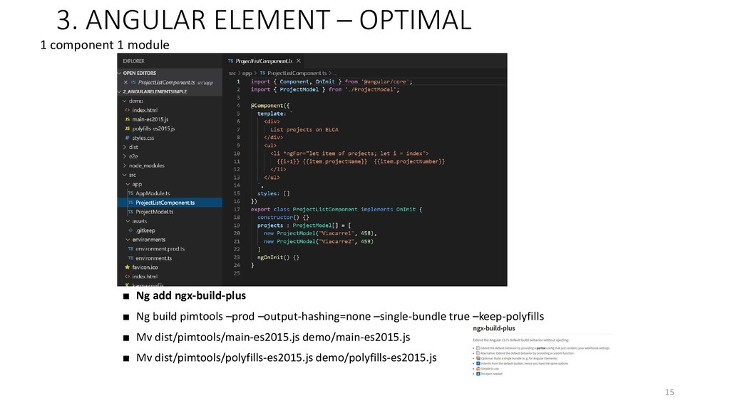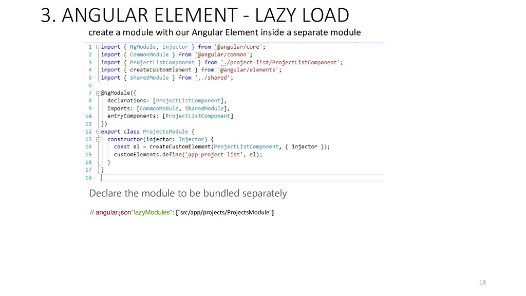 with our Angular Element inside a separate module Declare the module to be bundled separately // angular.json"lazyModules": ["src/app/projects/ProjectsModule"]