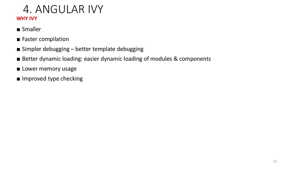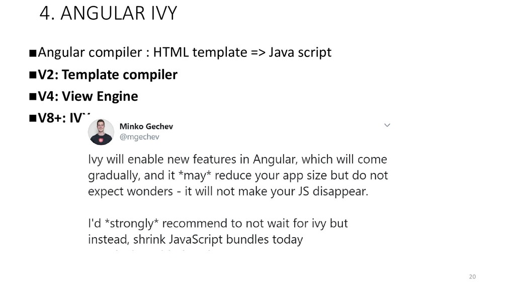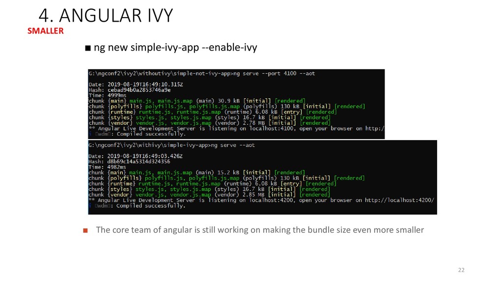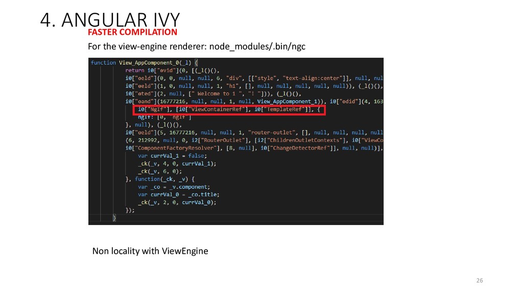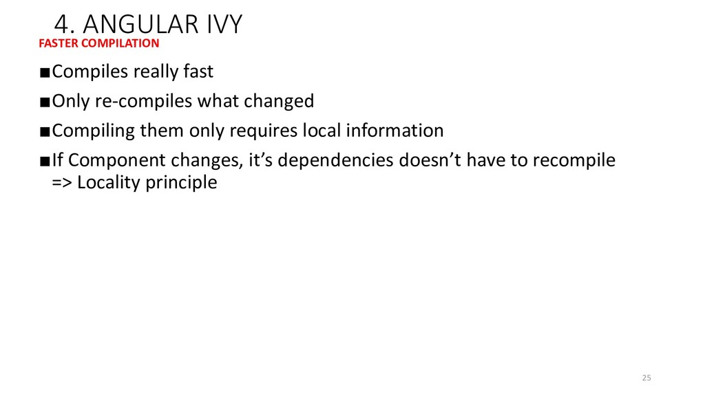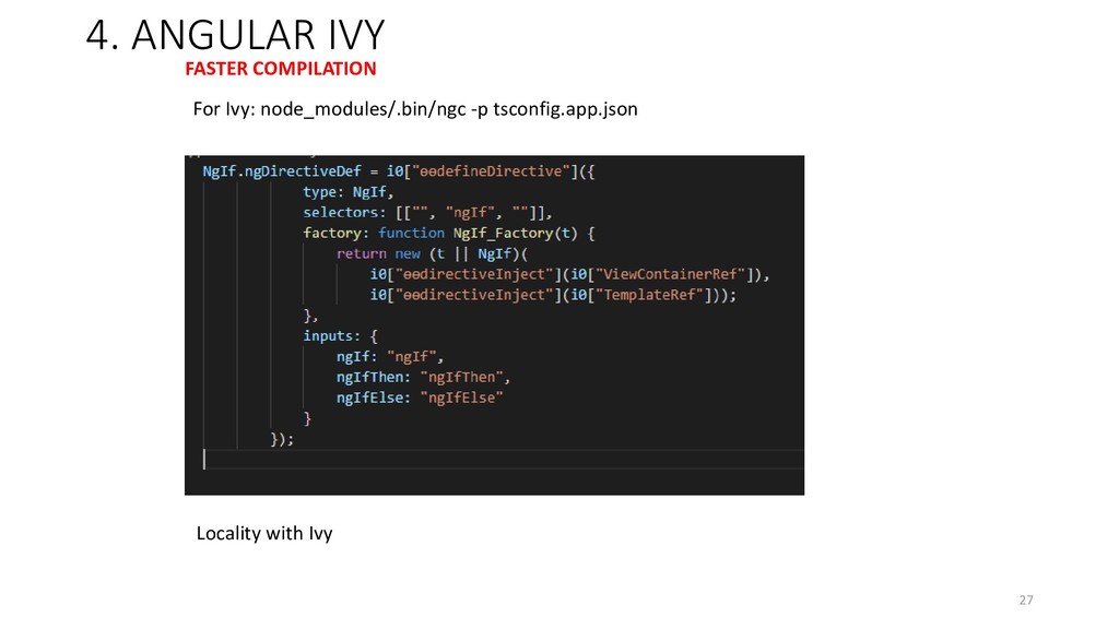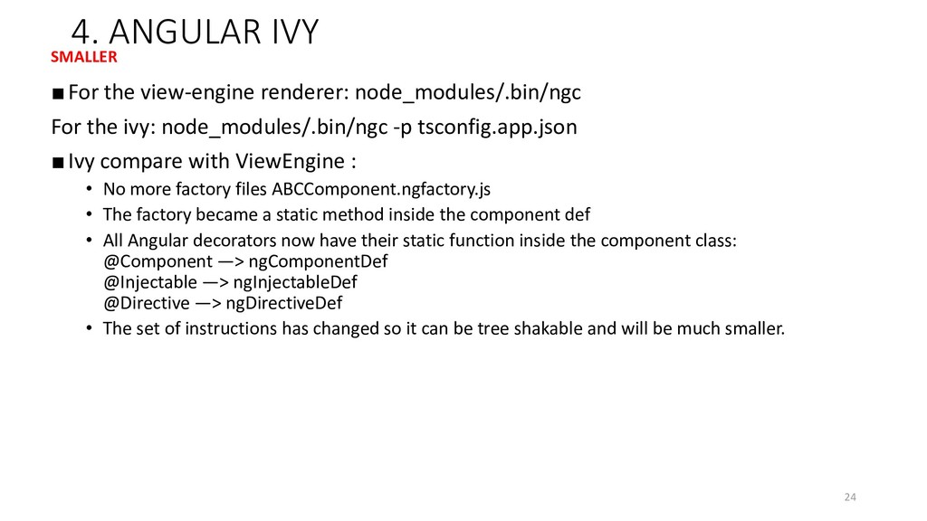 the ivy: node_modules/.bin/ngc -p tsconfig.app.json ▪Ivy compare with ViewEngine : • No more factory files ABCComponent.ngfactory.js • The factory became a static method inside the component def • All Angular decorators now have their static function inside the component class: @Component —> ngComponentDef @Injectable —> ngInjectableDef @Directive —> ngDirectiveDef • The set of instructions has changed so it can be tree shakable and will be much smaller. 24