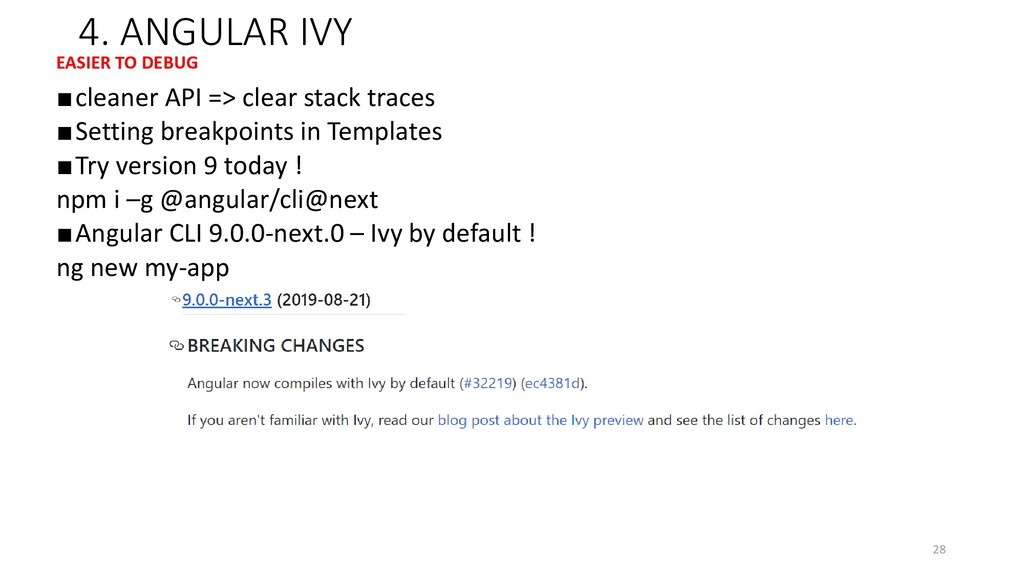 stack traces ▪Setting breakpoints in Templates ▪Try version 9 today ! npm i –g @angular/cli@next ▪Angular CLI 9.0.0-next.0 – Ivy by default ! ng new my-app 28