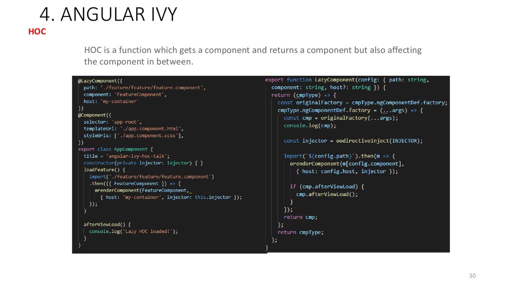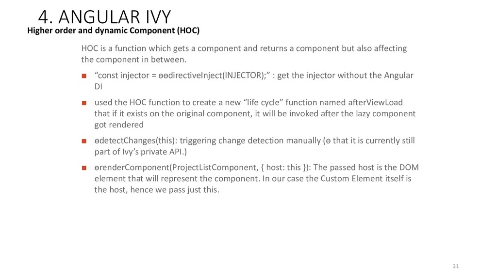 HOC is a function which gets a component and returns a component but also affecting the component in between. ▪ “const injector = ɵɵdirectiveInject(INJECTOR);” : get the injector without the Angular DI ▪ used the HOC function to create a new “life cycle” function named afterViewLoad that if it exists on the original component, it will be invoked after the lazy component got rendered ▪ ɵdetectChanges(this): triggering change detection manually (ɵ that it is currently still part of Ivy’s private API.) ▪ ɵrenderComponent(ProjectListComponent, { host: this }): The passed host is the DOM element that will represent the component. In our case the Custom Element itself is the host, hence we pass just this.