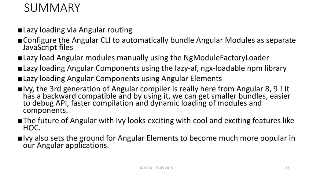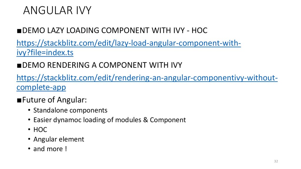 https://stackblitz.com/edit/lazy-load-angular-component-with- ivy?file=index.ts ▪DEMO RENDERING A COMPONENT WITH IVY https://stackblitz.com/edit/rendering-an-angular-componentivy-without- complete-app ▪Future of Angular: • Standalone components • Easier dynamoc loading of modules & Component • HOC • Angular element • and more ! 32