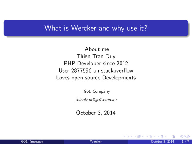 touch to move even faster. You can set your CI server to deploy your software after each green build, usually of the master branch (with Git). It could mean push the code/build to all your servers, backup the database, run database migrations and then restart whatever that needs to be restarted, without any human interaction. It will help us: Code Style Check, Code mergeability (are there any merge conflicts), Browser testing, Deployment, Backup, Minifiy and concate js and css, Compile sass/less/etc, Run composer, Test case...Test case... GO1 (meetup) Wercker October 3, 2014 4 / 7