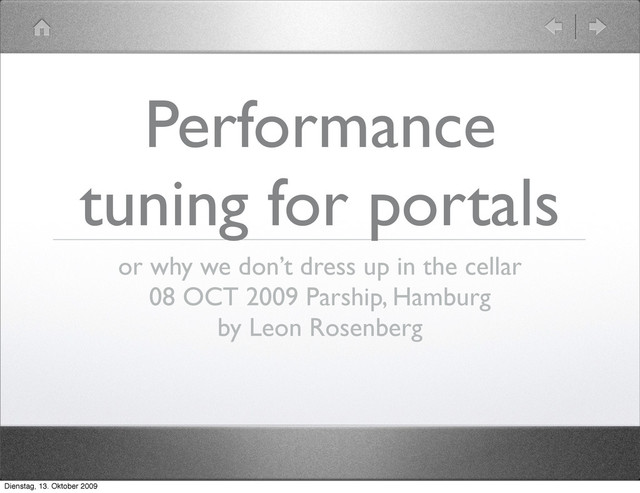 about 97% of the time: premature optimization is the root of all evil." Donald Knuth Whatever you do, measure, find the problem, find the solution, measure again. Dienstag, 13. Oktober 2009