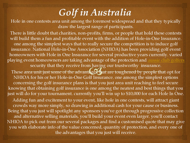 and that they typically draw the largest range of participants. There is little doubt that charities, non-profits, firms, or people that hold these contests will build them a fun and profitable event with the addition of Hole-in-One Insurance. one among the simplest ways that to really secure the competition is to induce golf insurance. National Hole-in-One Association (NHIOA) has been providing golf event homeowners with Hole in One Insurance for several productive years currently. varied playing event homeowners are taking advantage of the protection and aussie club golfers security that they receive from having our trustworthy insurance. These area unit just some of the advantages that are toughened by people that opt for NHIOA for his or her Hole-in-One Golf Insurance. one among the simplest options concerning the golf insurance plans is that you just area unit reaching to feel secure knowing that obtaining golf insurance is one among the neatest and best things that you just will do for your tournament. currently you'll win up to $10,000 for each Hole In One. Adding fun and excitement to your event, like hole in one contests, will attract giant crowds way more simply, so drawing in additional cash for your cause or business. Being that you just will spotlight any sponsors you've got through progressive collection and alternative selling materials, you'll build your event even larger. you'll contact NHIOA to pick out from our several packages and find a customised quote that may give you with elaborate info of the value concerned, quantity of protection, and every one of the advantages that you just will receive.