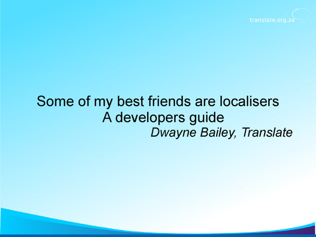 The aim of this talk is to raise some of the issues in file formats, localisable strings, language choice and process that can make localization frustrating. Developers who attend should be able to walk away with a much better understanding of how what they do ripples into the lives of localizers. They should be better equipped to help improve the lives of their localizers and be better informed of the impact that their decisions will have on the localization team.
