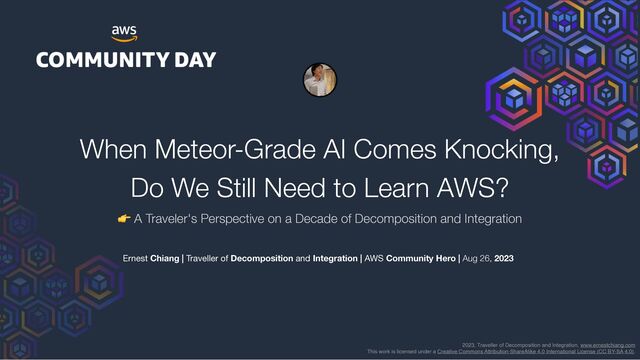licensed under a Creative Commons Attribution-ShareAlike 4.0 International License (CC BY-SA 4.0). When Meteor-Grade AI Comes Knocking, Do We Still Need to Learn AWS? 👉 A Traveler's Perspective on a Decade of Decomposition and Integration Ernest Chiang | Traveller of Decomposition and Integration | AWS Community Hero | Aug 26, 2023