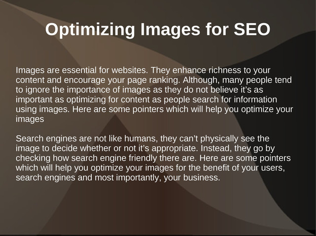 enhance richness to your content and encourage your page ranking. Although, many people tend to ignore the importance of images as they do not believe it’s as important as optimizing for content as people search for information using images. Here are some pointers which will help you optimize your images Search engines are not like humans, they can’t physically see the image to decide whether or not it’s appropriate. Instead, they go by checking how search engine friendly there are. Here are some pointers which will help you optimize your images for the benefit of your users, search engines and most importantly, your business.