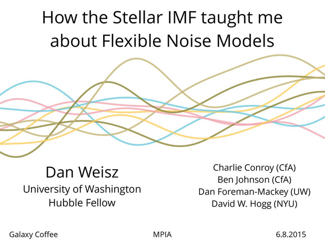 cal- alibration- to produce pect to the can be ex- However, gth ranges, calibration ynomials) It is there- odel of the n the like- lization of hat allows ntroduced dified log- ⇤ smaller `. The multiplication by µn µn0 in the kernel function signifies that it is defined in fractional terms. Using a high order polynomial can result in strong degeneracies between model and polynomial parameters, whereas the Gaussian Pro cess BDJ make this more precise and correct likelihood only reduces the penalty for residuals on the scale of ` with ampli tude a that can’t be fit by the mean model. The two log-likelihoods, for photometry and spectroscopy are combined into a single likelihood function, ln p(ds,dp |✓,↵,b) = ln pspec(ds |✓,↵)+ln pphot(dp |✓,b) . (10 where now ds is the spectroscopic data and dp is the photo metric data. The spectroscopic likelihood pspec is given by equation (3) and pphot is given by equation (2). 3. DATA AND EXPERIMENTAL SETUP We are now left to demonstrate that, by including photom etry as well as spectroscopy, it is possible to infer the param eters of interest ✓ while marginalizing over the calibration pa Physical Model (IMF, Av, mass, redshift, velocity, …) http://dan.iel.fm/python-fsps low order polynomial to capture broad variations spectroscopic noise model Gaussian Process to model small- scale residuals (2 parameters) & http://dan.iel.fm/george/ include ‘jitter’ term for each photometric point photometric noise model ds : spectroscopy dP : photometry