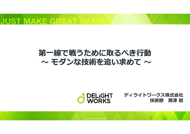 Copyright 2019 DELiGHTWORKS. 第一線で戦うために取るべき行動 ~ モダンな技術を追い求めて ~ ディライトワークス株式会社 技術部 黒澤