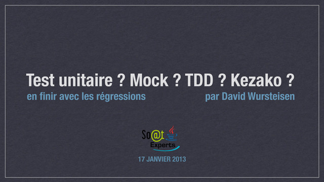 Vous subissez les régressions à chaque livraison ? Vous ne voyez pas l’intérêt des tests unitaires car ils ne servent qu’à tester des additions ? Si c’est le cas, suivez David dans la quête du Test Driven Development. Nous rencontrerons pléthore d'ennemies contre lesquels nous aurons à combattre : bugs, complexité, code statique, couplage fort. Ils essaieront de nous barrer la route, mais heureusement, nous pourrons compter sur nos alliés jUnit, Mockito, refactoring et injection/dépendance.