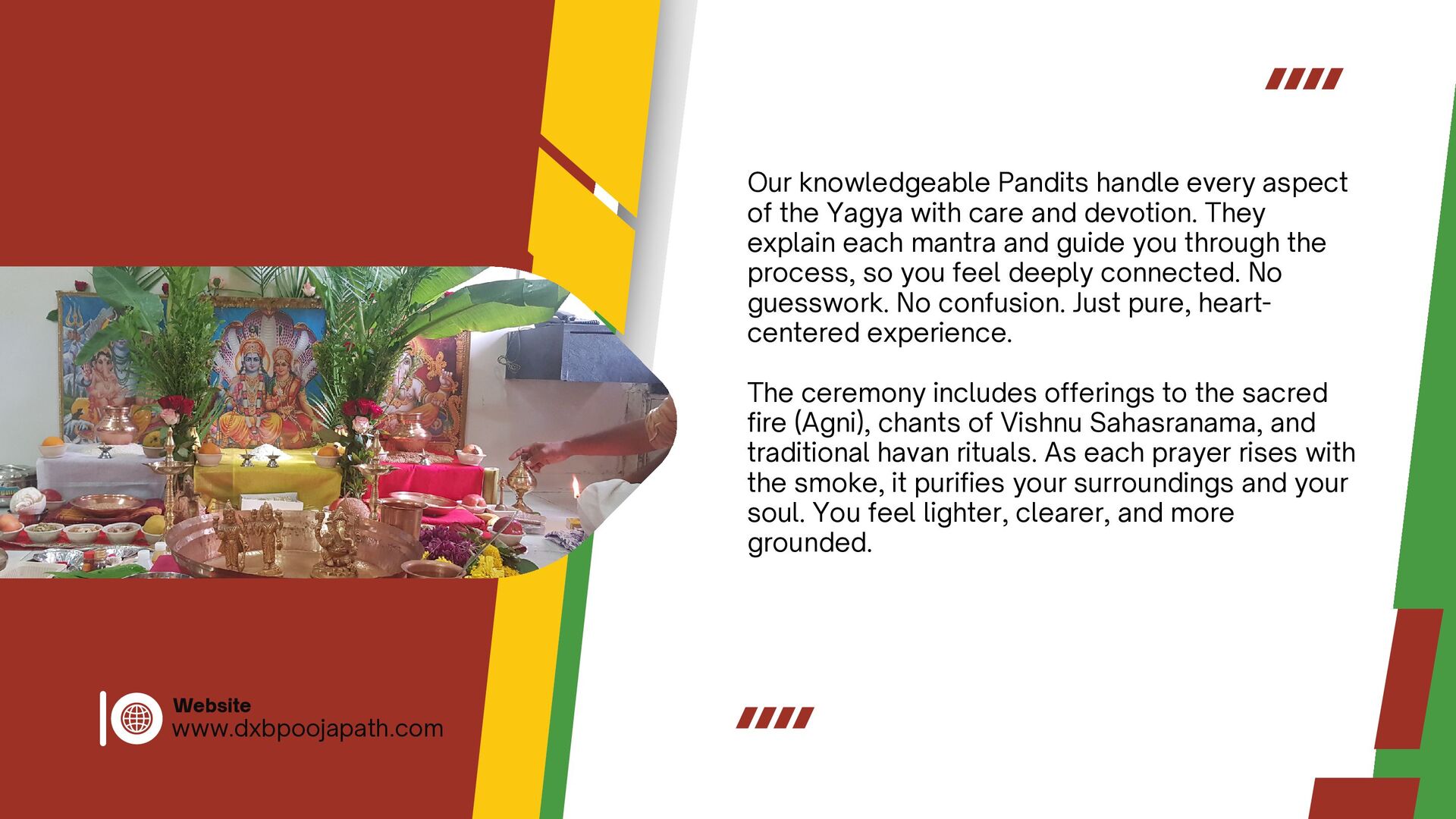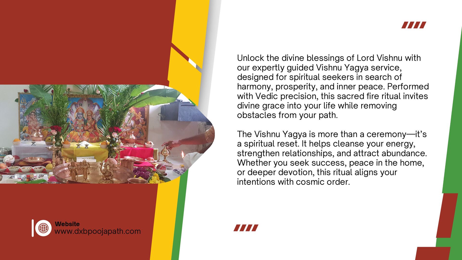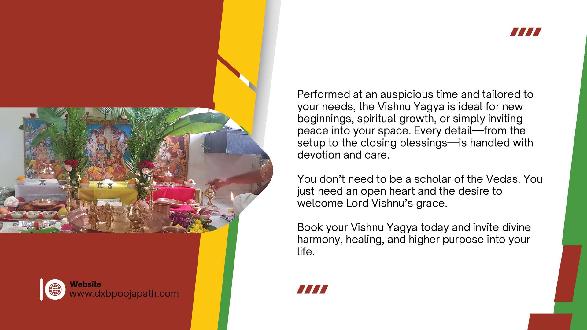 the Vishnu Yagya is ideal for new beginnings, spiritual growth, or simply inviting peace into your space. Every detail—from the setup to the closing blessings—is handled with devotion and care. You don’t need to be a scholar of the Vedas. You just need an open heart and the desire to welcome Lord Vishnu’s grace. Book your Vishnu Yagya today and invite divine harmony, healing, and higher purpose into your life. www.dxbpoojapath.com Website
