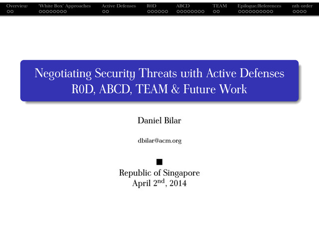 nth order References II P. Baecher, M. Koetter, T. Holz, M. Dornseif, and F. Freiling, The nepenthes platform: An e cient approach to collect malware, Lecture notes in computer science (2006), 165–184. Bill Blunden, The rootkit arsenal: Escape and evasion in the dark corners of the system, Wordware Publishing, 2009. D. Bilar, J. Murphy, and G. Cybenko, Adversarial dynamics: Conficker case study, Moving Target Defenses (S. Jajodia, ed.), vol. II, Springer, 2013, pp. 41–71. Alvaro A. Cárdenas, Saurabh Amin, Zong-Syun Lin, Yu-Lun Huang, Chi-Yen Huang, and Shankar Sastry, Attacks against process control systems: risk assessment, detection, and response, Proceedings of the 6th ACM Symposium on Information, Computer and Communications Security (New York, NY, USA), ASIACCS ’11, ACM, 2011, pp. 355–366. X. Chen, J. Andersen, Z.M. Mao, M. Bailey, and J. Nazario, Towards an understanding of anti-virtualization and anti-debugging behavior in modern malware, Dependable Systems and Networks With FTCS and DCC, 2008. DSN 2008. IEEE International Conference on, IEEE, 2008, pp. 177–186. George Cybenko and Vincent Berk, An overview of process query systems, Proc. SPIE, vol. 5403, 2004. , Process detection in homeland security and defense applications, Proc. SPIE 6201 (2006). Varun Chandola, Arindam Banerjee, and Vipin Kumar, Anomaly detection: A survey, ACM Comput. Surv. 41 (2009), no. 3, 15:1–15:58.