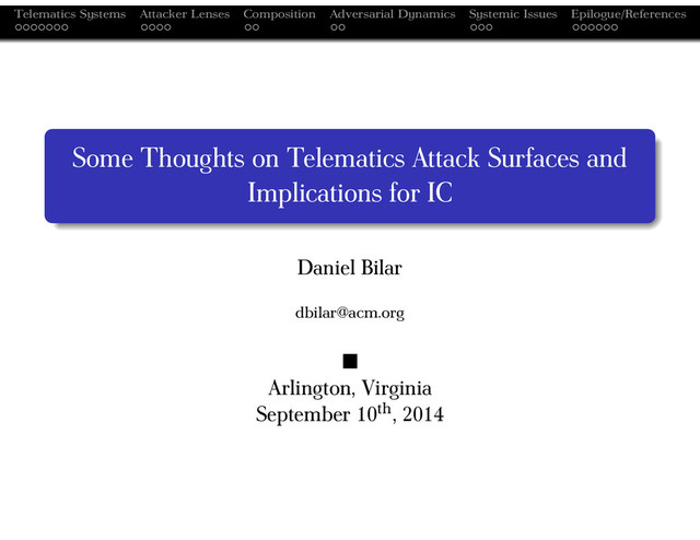 References I Gary Anthes, Mechanism design meets computer science., Commun. ACM 53 (2010), no. 8, 11–13. Daniel Bilar, On nth order attacks, The virtual battlefield : Perspectives on cyber warfare (Christian Czosseck and Kenneth Geers, eds.), IOS Press, 2009, pp. 262–281. , Degradation and subversion through subsystem attacks, IEEE Security & Privacy 8 (2010), no. 4, 70–73. D. Bilar, J. Murphy, and G. Cybenko, Adversarial dynamics: Conficker case study, Moving Target Defenses (S. Jajodia, ed.), vol. II, Springer, 2013, pp. 41–71. Jean Carlson and John Doyle, Highly Optimized Tolerance: Robustness and Design in Complex Systems, Physical Review Letters 84 (2000), no. 11, 2529+. Cesar Cerrudo, Hacking us tra c control systems, DefCon, vol. 22, 2014. Aaron Clauset, Cosma R. Shalizi, and Mark Newman, Power-Law Distributions in Empirical Data, SIAM Reviews (2007).