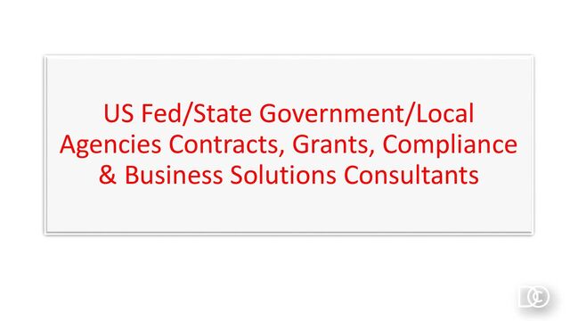 We specialize in US Fed / State Government / Local Agencies Contracts, Acquisition Planning/Strategy, Capture Management, Bid /No Bid Analysis, Proposal & Grant Writing, Management & Compliance, Cost Analysis, DCAA Audit, Flow Down Clauses, Reverse Auction Training and more.
