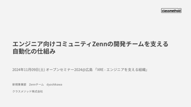 2024年11⽉09⽇(⼟) オープンセミナー2024@広島 「XRE - エンジニアを⽀える組織」 エンジニア向けコミュニティZennの開発チームを⽀える ⾃動化の仕組み 新規事業部 Zennチーム dyoshikawa クラスメソッド株式会社