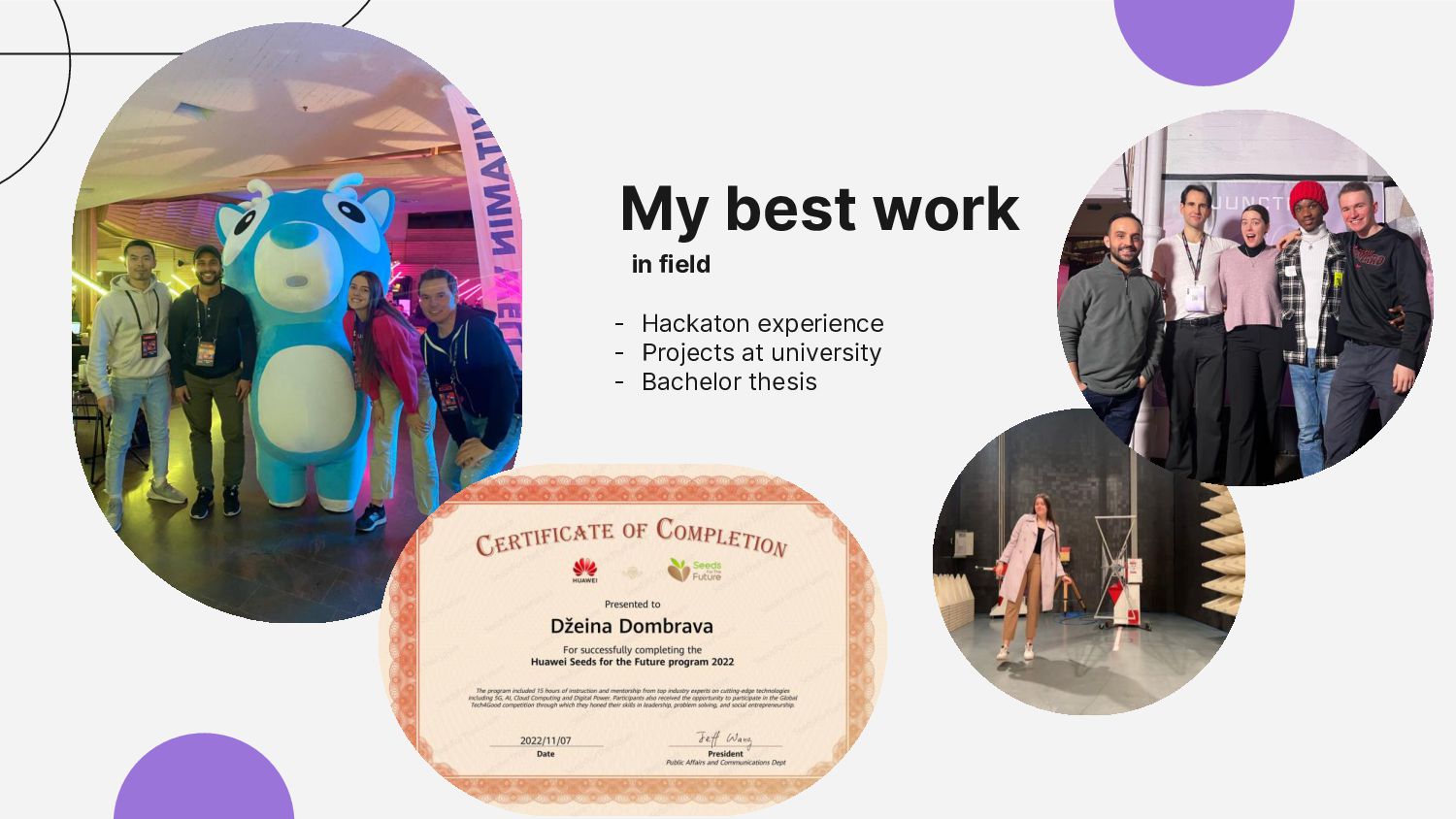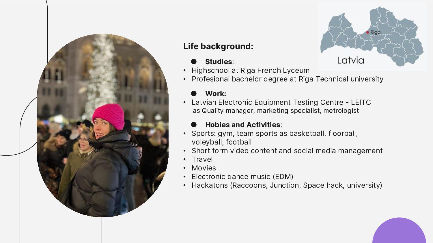 • Profesional bachelor degree at Riga Technical university • Work: • Latvian Electronic Equipment Testing Centre - LEITC as Quality manager, marketing specialist, metrologist • Hobies and Activities: • Sports: gym, team sports as basketball, floorball, voleyball, football • Short form video content and social media management • Travel • Movies • Electronic dance music (EDM) • Hackatons (Raccoons, Junction, Space hack, university)