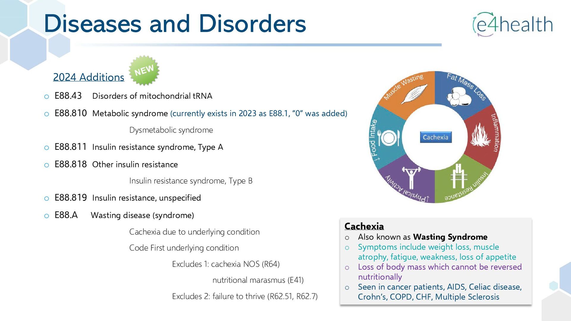 E88.810 Metabolic syndrome (currently exists in 2023 as E88.1, “0” was added) Dysmetabolic syndrome o E88.811 Insulin resistance syndrome, Type A o E88.818 Other insulin resistance Insulin resistance syndrome, Type B o E88.819 Insulin resistance, unspecified o E88.A Wasting disease (syndrome) Cachexia due to underlying condition Code First underlying condition Excludes 1: cachexia NOS (R64) nutritional marasmus (E41) Excludes 2: failure to thrive (R62.51, R62.7) 2024 Additions Cachexia o Also known as Wasting Syndrome o Symptoms include weight loss, muscle atrophy, fatigue, weakness, loss of appetite o Loss of body mass which cannot be reversed nutritionally o Seen in cancer patients, AIDS, Celiac disease, Crohn’s, COPD, CHF, Multiple Sclerosis