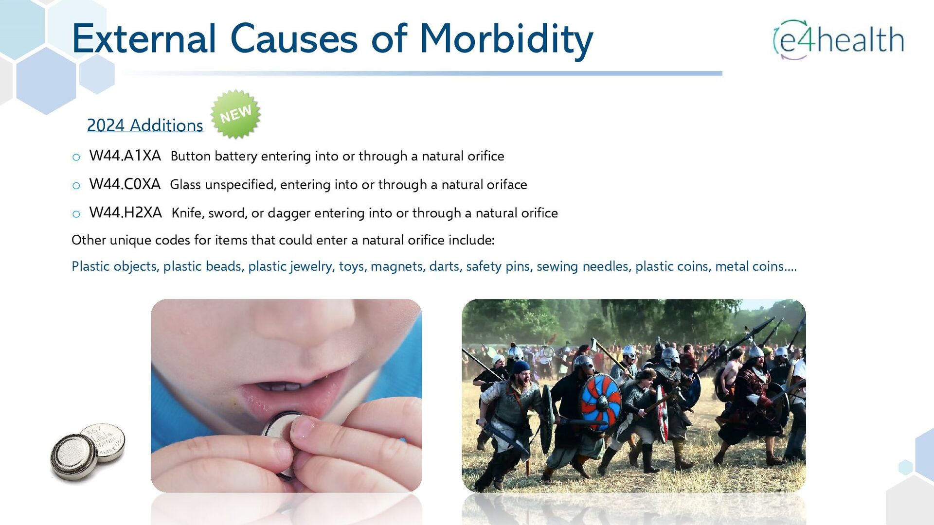 12. External Causes of Morbidity o W44.A1XA Button battery entering into