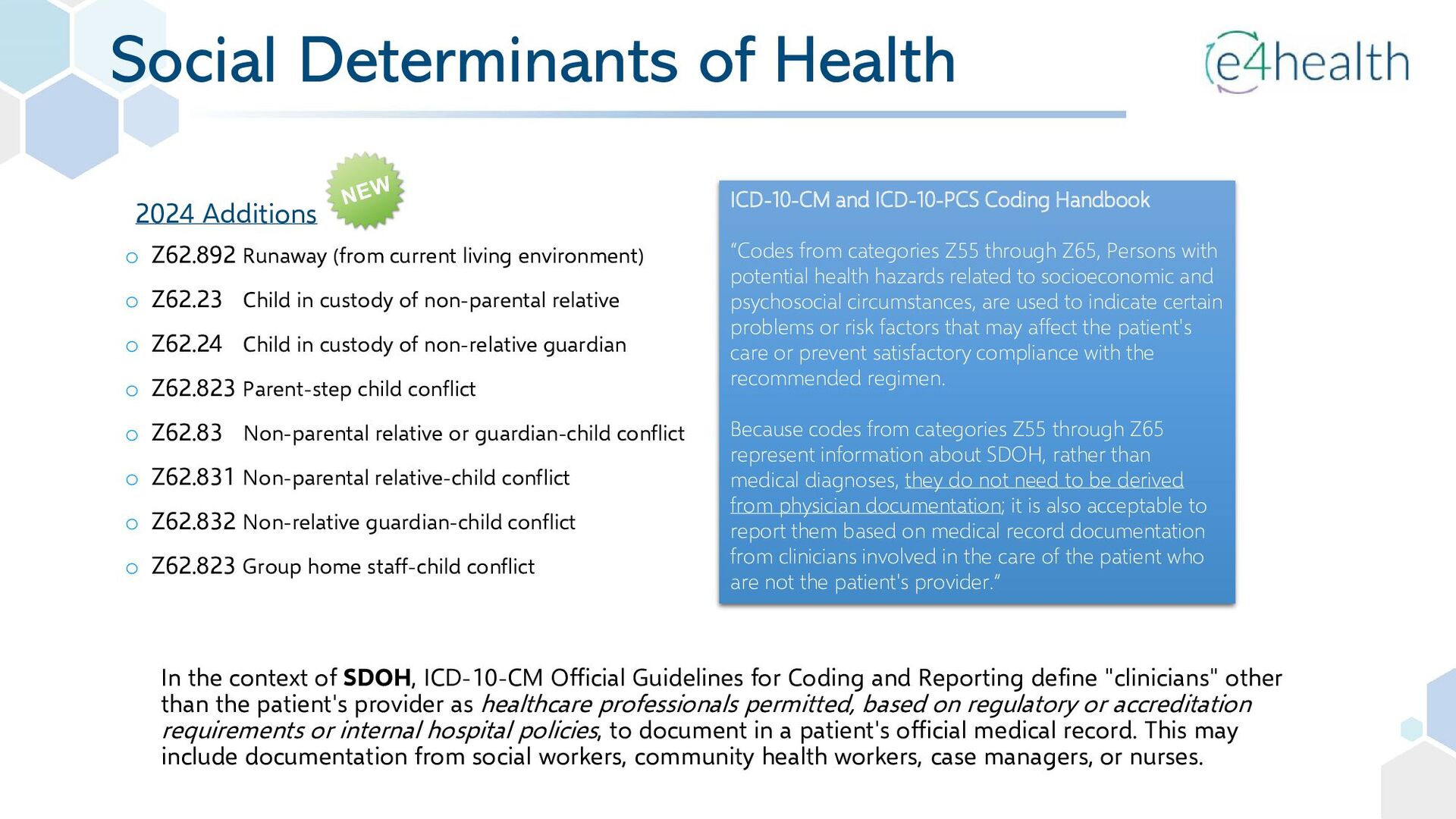 environment) o Z62.23 Child in custody of non-parental relative o Z62.24 Child in custody of non-relative guardian o Z62.823 Parent-step child conflict o Z62.83 Non-parental relative or guardian-child conflict o Z62.831 Non-parental relative-child conflict o Z62.832 Non-relative guardian-child conflict o Z62.823 Group home staff-child conflict ICD-10-CM and ICD-10-PCS Coding Handbook “Codes from categories Z55 through Z65, Persons with potential health hazards related to socioeconomic and psychosocial circumstances, are used to indicate certain problems or risk factors that may affect the patient's care or prevent satisfactory compliance with the recommended regimen. Because codes from categories Z55 through Z65 represent information about SDOH, rather than medical diagnoses, they do not need to be derived from physician documentation; it is also acceptable to report them based on medical record documentation from clinicians involved in the care of the patient who are not the patient's provider.” 2024 Additions In the context of SDOH, ICD-10-CM Official Guidelines for Coding and Reporting define "clinicians" other than the patient's provider as healthcare professionals permitted, based on regulatory or accreditation requirements or internal hospital policies, to document in a patient's official medical record. This may include documentation from social workers, community health workers, case managers, or nurses.