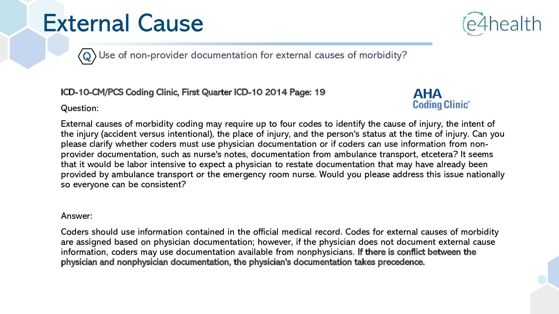 morbidity? ICD-10-CM/PCS Coding Clinic, First Quarter ICD-10 2014 Page: 19 Question: External causes of morbidity coding may require up to four codes to identify the cause of injury, the intent of the injury (accident versus intentional), the place of injury, and the person's status at the time of injury. Can you please clarify whether coders must use physician documentation or if coders can use information from non- provider documentation, such as nurse's notes, documentation from ambulance transport, etcetera? It seems that it would be labor intensive to expect a physician to restate documentation that may have already been provided by ambulance transport or the emergency room nurse. Would you please address this issue nationally so everyone can be consistent? Answer: Coders should use information contained in the official medical record. Codes for external causes of morbidity are assigned based on physician documentation; however, if the physician does not document external cause information, coders may use documentation available from nonphysicians. If there is conflict between the physician and nonphysician documentation, the physician's documentation takes precedence.