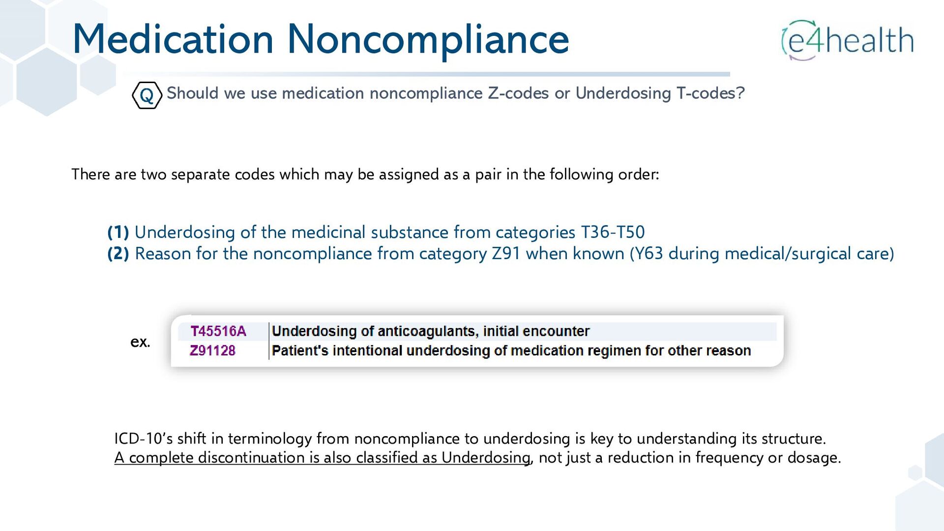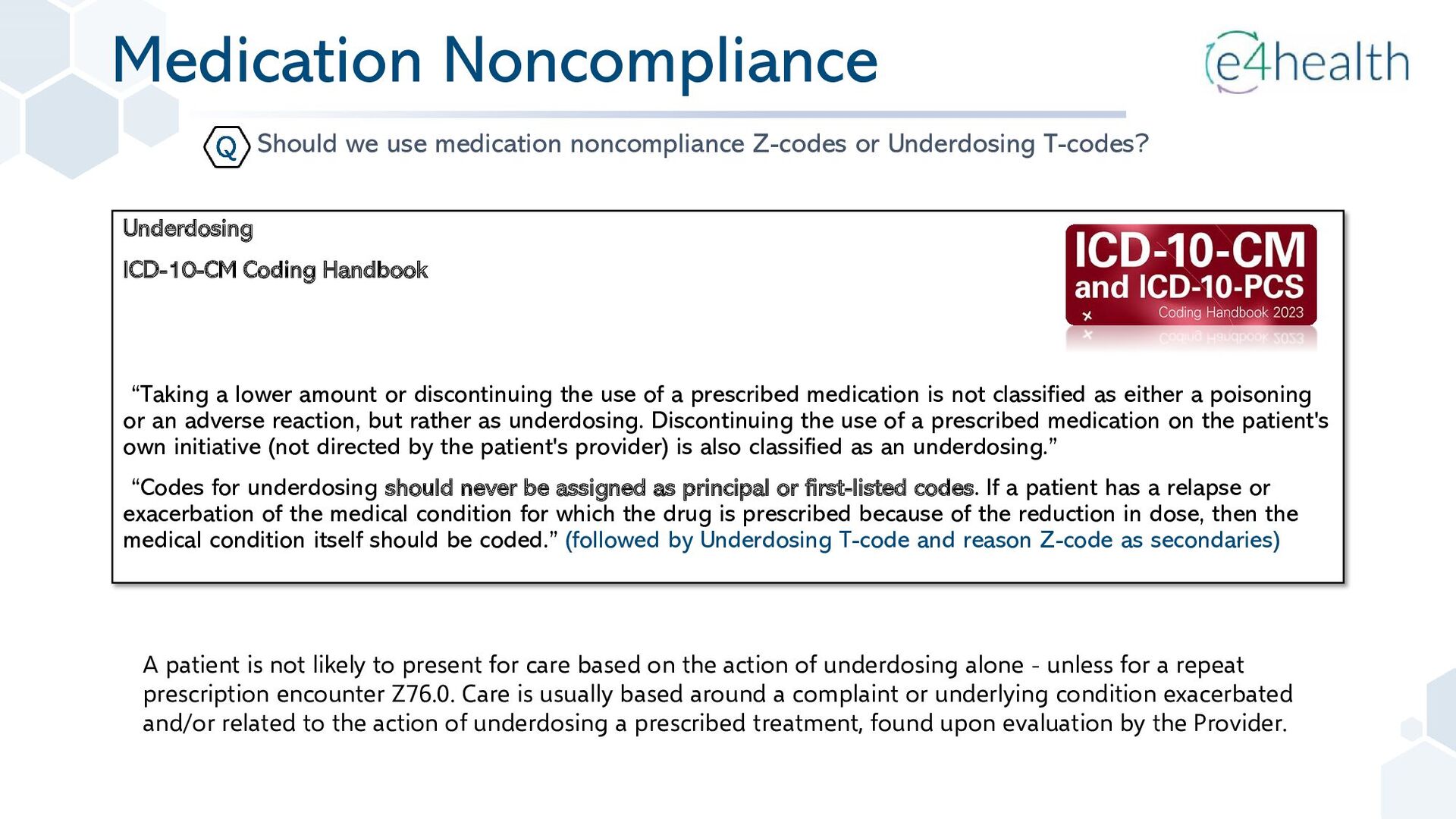 ICD-10-CM Coding Handbook “Taking a lower amount or discontinuing the use of a prescribed medication is not classified as either a poisoning or an adverse reaction, but rather as underdosing. Discontinuing the use of a prescribed medication on the patient's own initiative (not directed by the patient's provider) is also classified as an underdosing.” “Codes for underdosing should never be assigned as principal or first-listed codes. If a patient has a relapse or exacerbation of the medical condition for which the drug is prescribed because of the reduction in dose, then the medical condition itself should be coded.” (followed by Underdosing T-code and reason Z-code as secondaries) Medication Noncompliance A patient is not likely to present for care based on the action of underdosing alone - unless for a repeat prescription encounter Z76.0. Care is usually based around a complaint or underlying condition exacerbated and/or related to the action of underdosing a prescribed treatment, found upon evaluation by the Provider.
