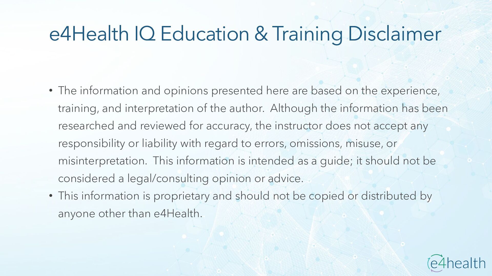 opinions presented here are based on the experience, training, and interpretation of the author. Although the information has been researched and reviewed for accuracy, the instructor does not accept any responsibility or liability with regard to errors, omissions, misuse, or misinterpretation. This information is intended as a guide; it should not be considered a legal/consulting opinion or advice. • This information is proprietary and should not be copied or distributed by anyone other than e4Health.
