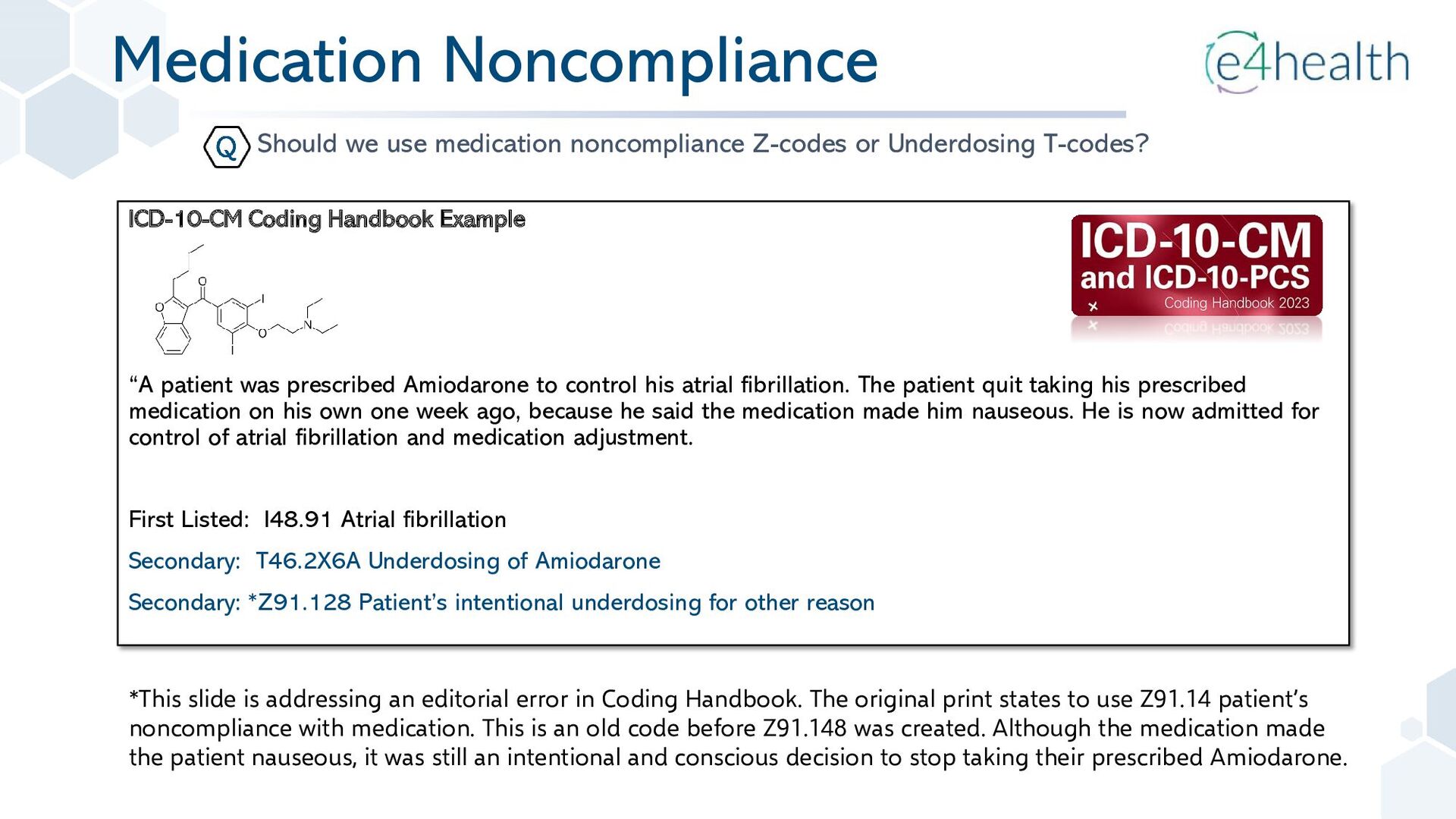 Coding Handbook Example “A patient was prescribed Amiodarone to control his atrial fibrillation. The patient quit taking his prescribed medication on his own one week ago, because he said the medication made him nauseous. He is now admitted for control of atrial fibrillation and medication adjustment. First Listed: I48.91 Atrial fibrillation Secondary: T46.2X6A Underdosing of Amiodarone Secondary: *Z91.128 Patient’s intentional underdosing for other reason Medication Noncompliance *This slide is addressing an editorial error in Coding Handbook. The original print states to use Z91.14 patient’s noncompliance with medication. This is an old code before Z91.148 was created. Although the medication made the patient nauseous, it was still an intentional and conscious decision to stop taking their prescribed Amiodarone.
