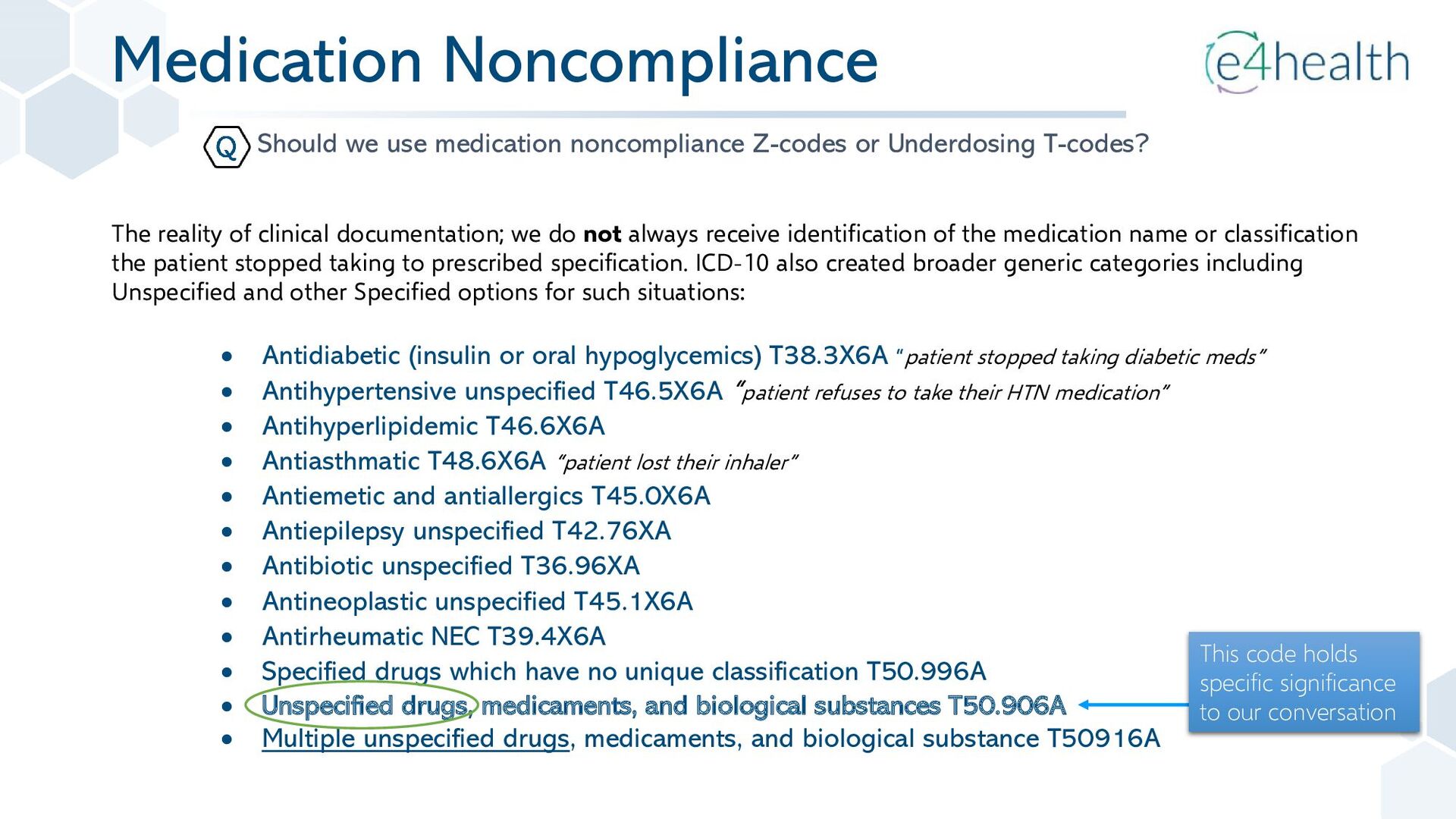 T-codes? The reality of clinical documentation; we do not always receive identification of the medication name or classification the patient stopped taking to prescribed specification. ICD-10 also created broader generic categories including Unspecified and other Specified options for such situations: • Antidiabetic (insulin or oral hypoglycemics) T38.3X6A “patient stopped taking diabetic meds” • Antihypertensive unspecified T46.5X6A “patient refuses to take their HTN medication” • Antihyperlipidemic T46.6X6A • Antiasthmatic T48.6X6A “patient lost their inhaler” • Antiemetic and antiallergics T45.0X6A • Antiepilepsy unspecified T42.76XA • Antibiotic unspecified T36.96XA • Antineoplastic unspecified T45.1X6A • Antirheumatic NEC T39.4X6A • Specified drugs which have no unique classification T50.996A • Unspecified drugs, medicaments, and biological substances T50.906A • Multiple unspecified drugs, medicaments, and biological substance T50916A This code holds specific significance to our conversation