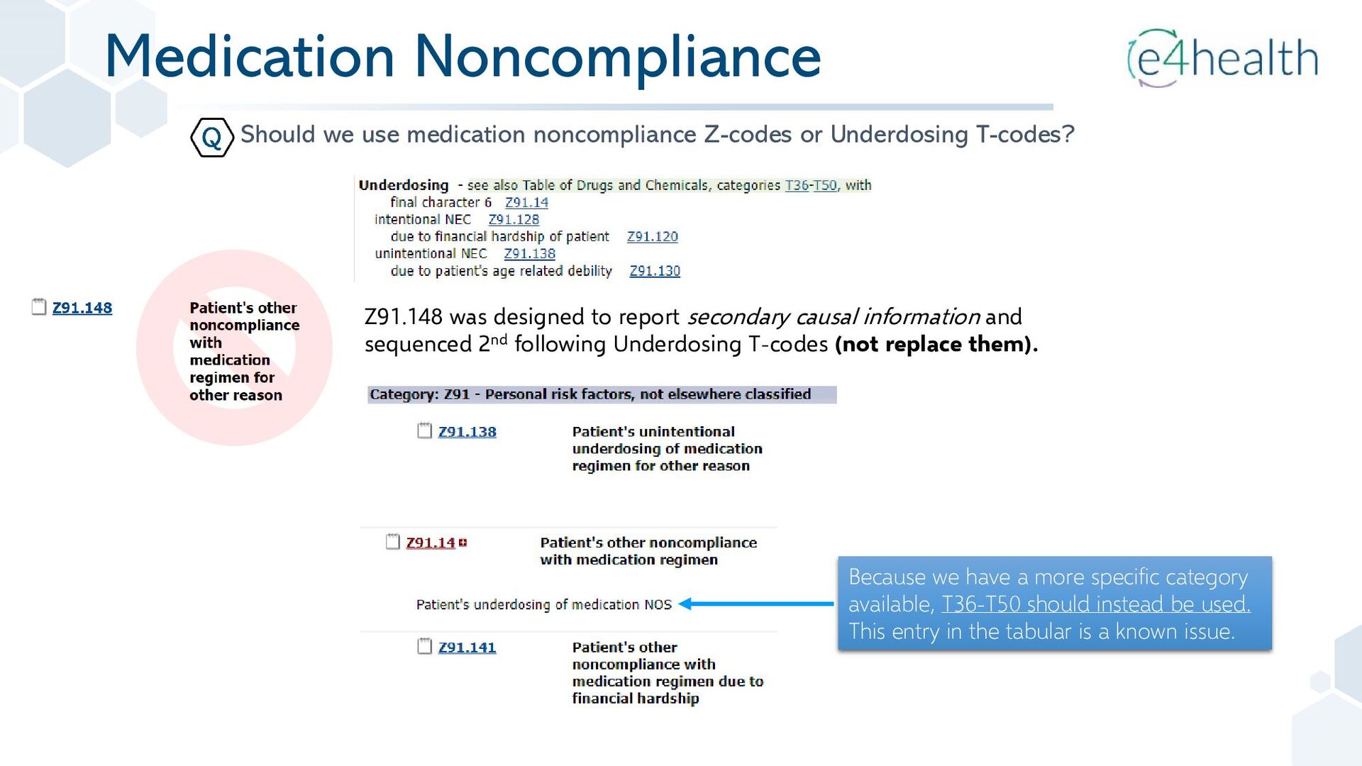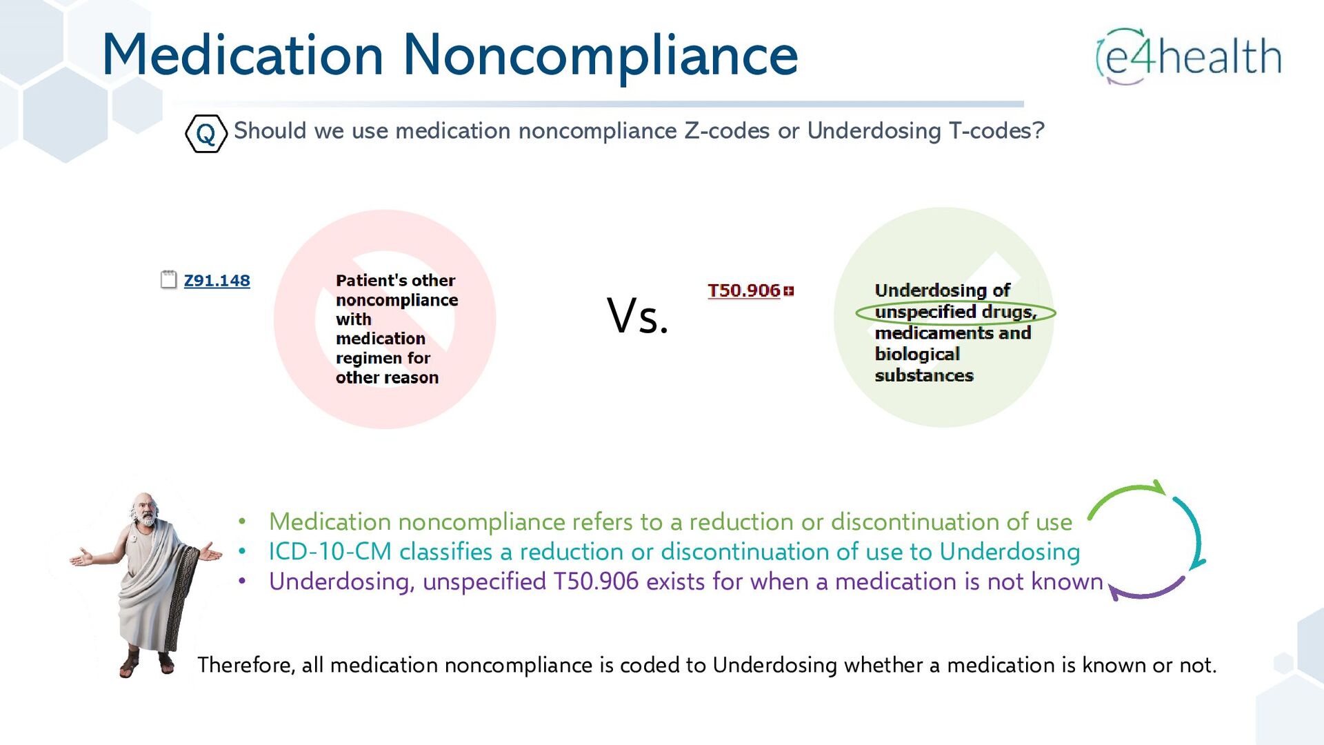 T-codes? Vs. • Medication noncompliance refers to a reduction or discontinuation of use • ICD-10-CM classifies a reduction or discontinuation of use to Underdosing • Underdosing, unspecified T50.906 exists for when a medication is not known Therefore, all medication noncompliance is coded to Underdosing whether a medication is known or not.