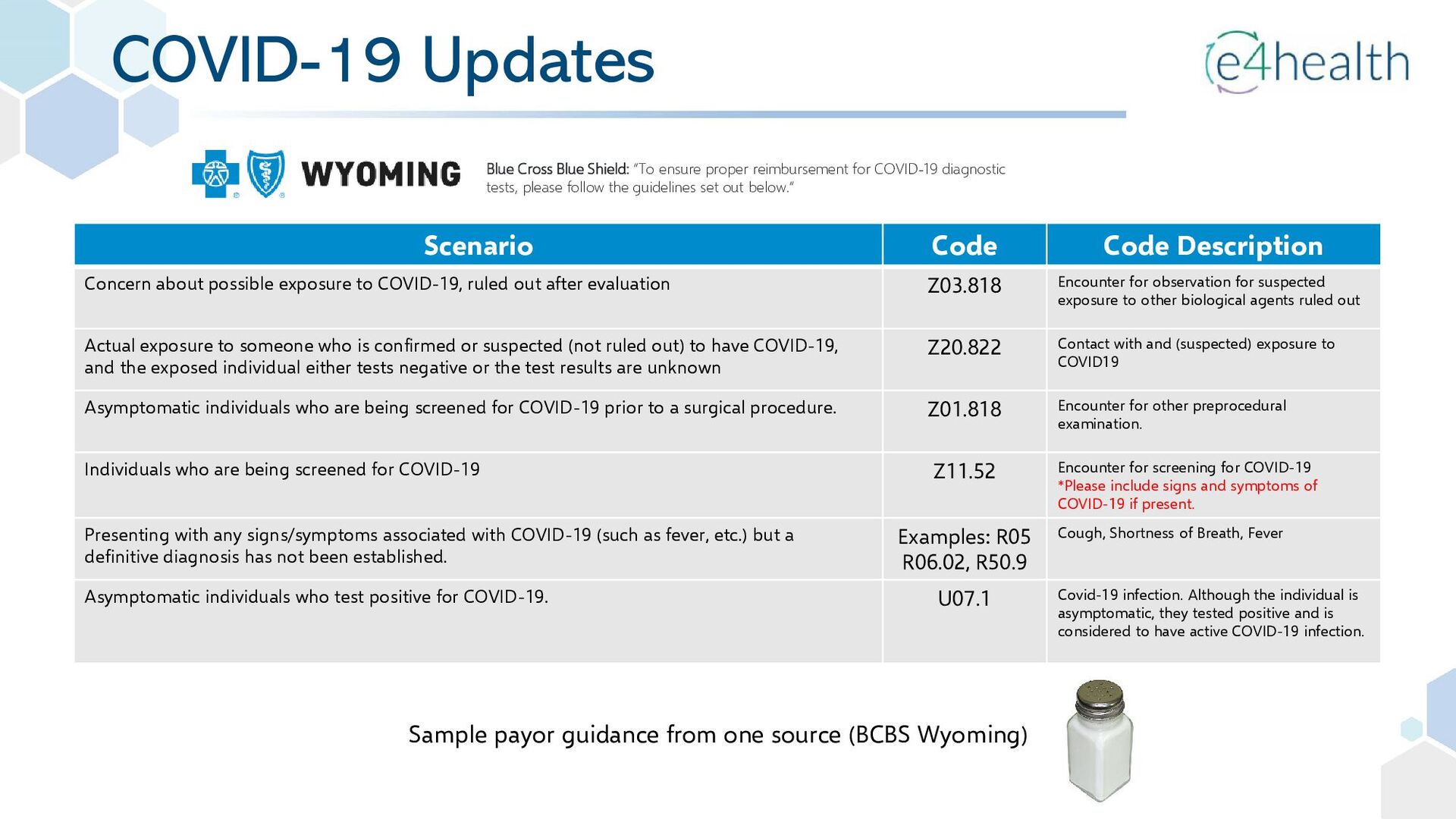 to COVID-19, ruled out after evaluation Z03.818 Encounter for observation for suspected exposure to other biological agents ruled out Actual exposure to someone who is confirmed or suspected (not ruled out) to have COVID-19, and the exposed individual either tests negative or the test results are unknown Z20.822 Contact with and (suspected) exposure to COVID19 Asymptomatic individuals who are being screened for COVID-19 prior to a surgical procedure. Z01.818 Encounter for other preprocedural examination. Individuals who are being screened for COVID-19 Z11.52 Encounter for screening for COVID-19 *Please include signs and symptoms of COVID-19 if present. Presenting with any signs/symptoms associated with COVID-19 (such as fever, etc.) but a definitive diagnosis has not been established. Examples: R05 R06.02, R50.9 Cough, Shortness of Breath, Fever Asymptomatic individuals who test positive for COVID-19. U07.1 Covid-19 infection. Although the individual is asymptomatic, they tested positive and is considered to have active COVID-19 infection. Blue Cross Blue Shield: “To ensure proper reimbursement for COVID-19 diagnostic tests, please follow the guidelines set out below.” Sample payor guidance from one source (BCBS Wyoming)