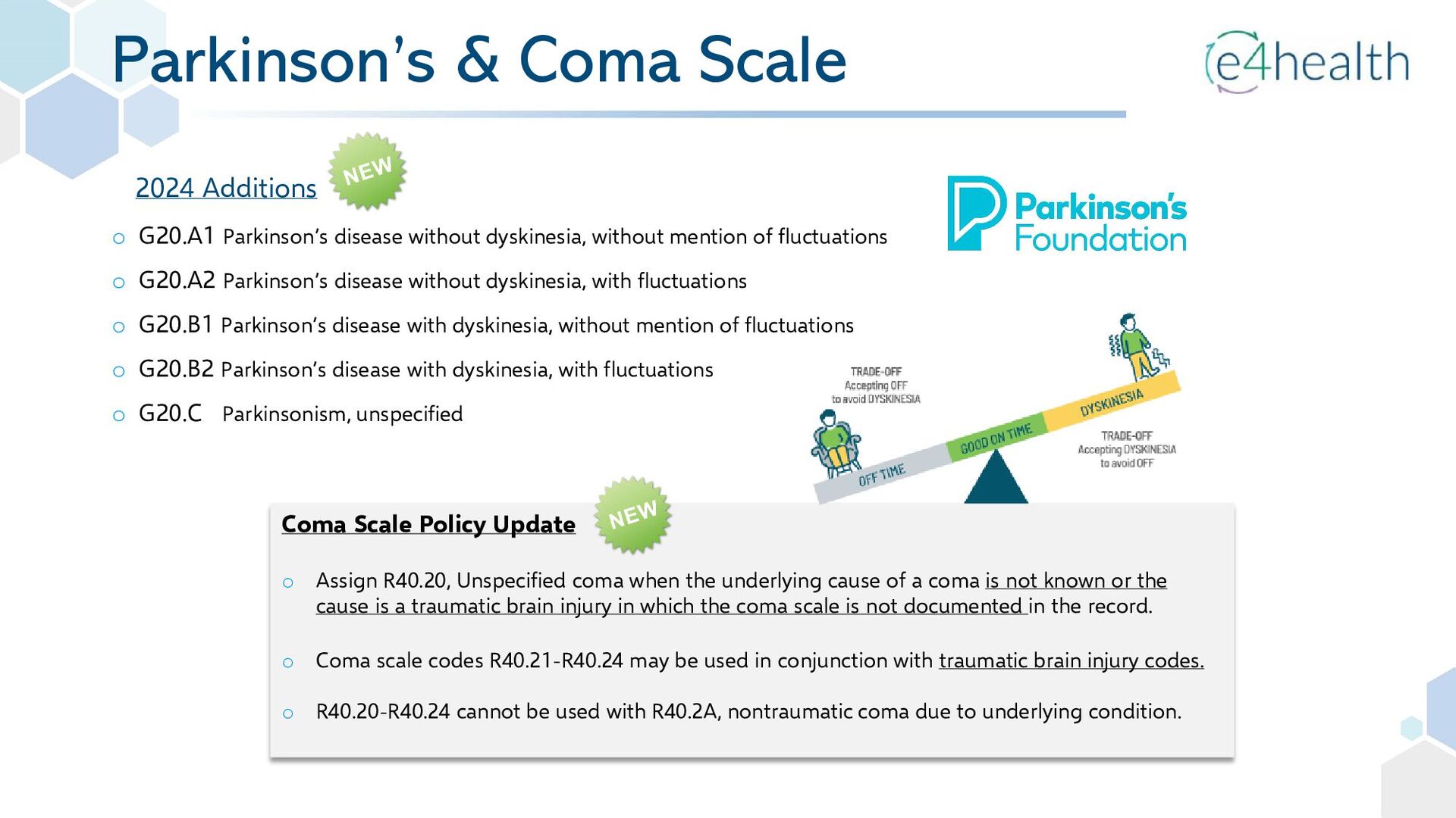without mention of fluctuations o G20.A2 Parkinson’s disease without dyskinesia, with fluctuations o G20.B1 Parkinson’s disease with dyskinesia, without mention of fluctuations o G20.B2 Parkinson’s disease with dyskinesia, with fluctuations o G20.C Parkinsonism, unspecified 2024 Additions Coma Scale Policy Update o Assign R40.20, Unspecified coma when the underlying cause of a coma is not known or the cause is a traumatic brain injury in which the coma scale is not documented in the record. o Coma scale codes R40.21-R40.24 may be used in conjunction with traumatic brain injury codes. o R40.20-R40.24 cannot be used with R40.2A, nontraumatic coma due to underlying condition.