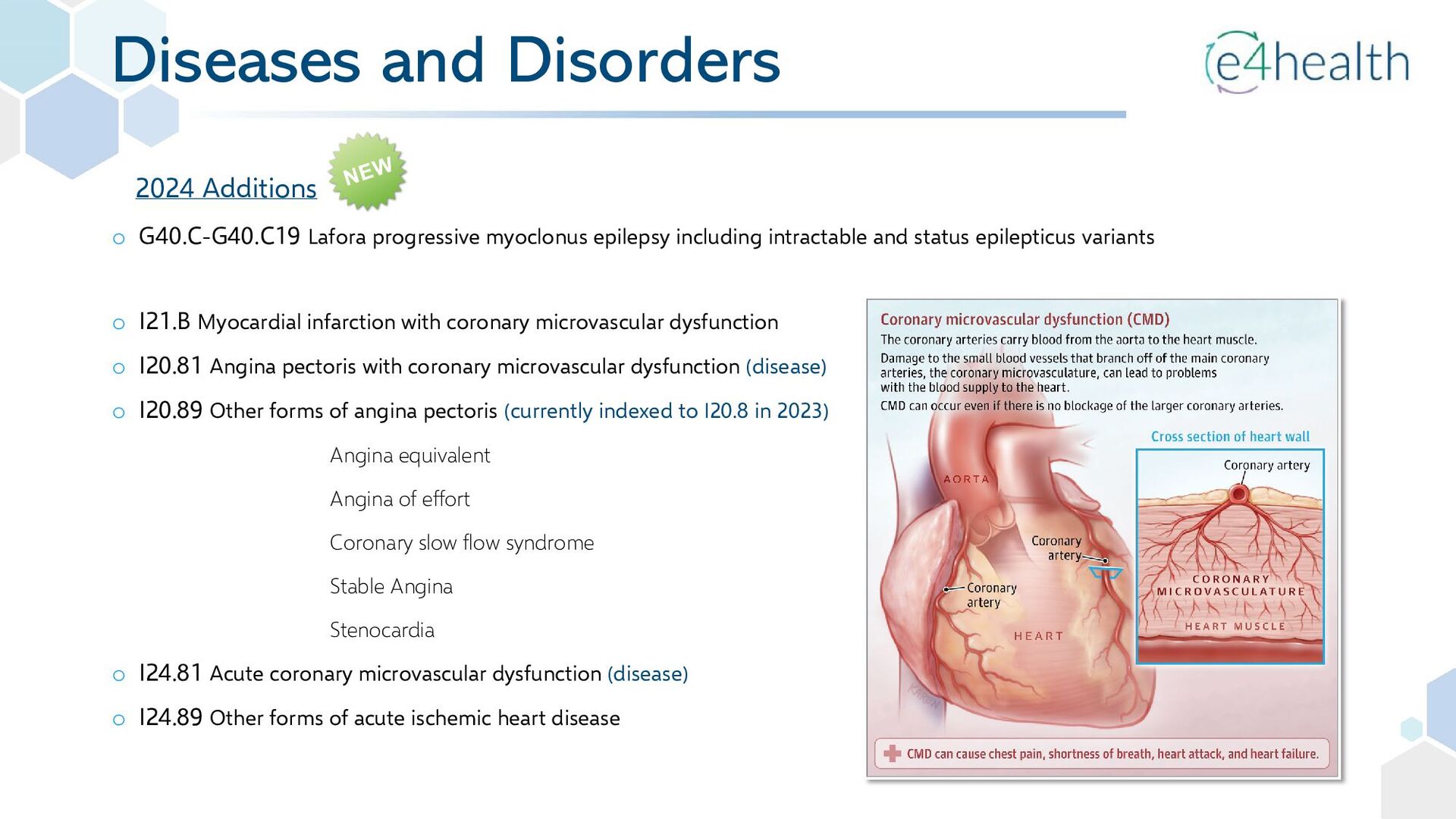 intractable and status epilepticus variants o I21.B Myocardial infarction with coronary microvascular dysfunction o I20.81 Angina pectoris with coronary microvascular dysfunction (disease) o I20.89 Other forms of angina pectoris (currently indexed to I20.8 in 2023) Angina equivalent Angina of effort Coronary slow flow syndrome Stable Angina Stenocardia o I24.81 Acute coronary microvascular dysfunction (disease) o I24.89 Other forms of acute ischemic heart disease 2024 Additions