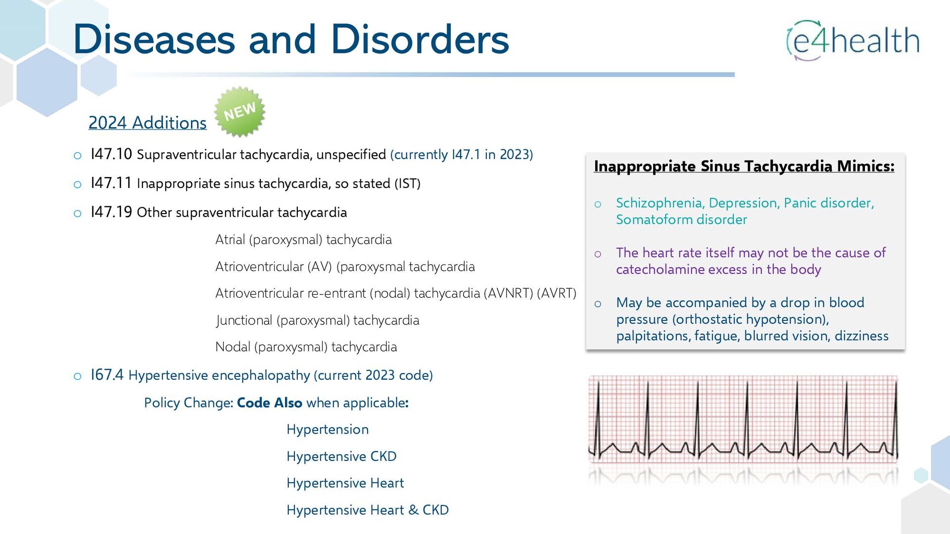 in 2023) o I47.11 Inappropriate sinus tachycardia, so stated (IST) o I47.19 Other supraventricular tachycardia Atrial (paroxysmal) tachycardia Atrioventricular (AV) (paroxysmal tachycardia Atrioventricular re-entrant (nodal) tachycardia (AVNRT) (AVRT) Junctional (paroxysmal) tachycardia Nodal (paroxysmal) tachycardia o I67.4 Hypertensive encephalopathy (current 2023 code) Policy Change: Code Also when applicable: Hypertension Hypertensive CKD Hypertensive Heart Hypertensive Heart & CKD 2024 Additions Inappropriate Sinus Tachycardia Mimics: o Schizophrenia, Depression, Panic disorder, Somatoform disorder o The heart rate itself may not be the cause of catecholamine excess in the body o May be accompanied by a drop in blood pressure (orthostatic hypotension), palpitations, fatigue, blurred vision, dizziness