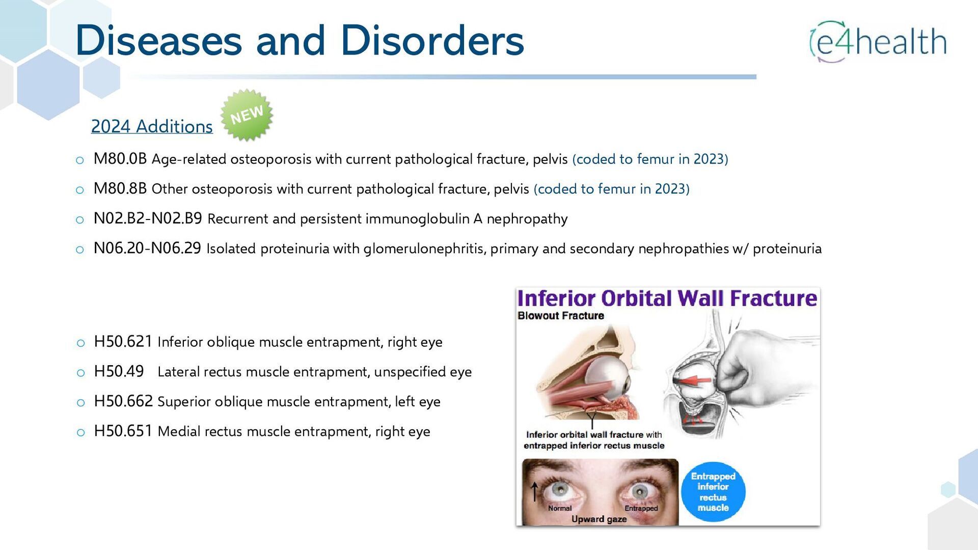 fracture, pelvis (coded to femur in 2023) o M80.8B Other osteoporosis with current pathological fracture, pelvis (coded to femur in 2023) o N02.B2-N02.B9 Recurrent and persistent immunoglobulin A nephropathy o N06.20-N06.29 Isolated proteinuria with glomerulonephritis, primary and secondary nephropathies w/ proteinuria 2024 Additions o H50.621 Inferior oblique muscle entrapment, right eye o H50.49 Lateral rectus muscle entrapment, unspecified eye o H50.662 Superior oblique muscle entrapment, left eye o H50.651 Medial rectus muscle entrapment, right eye