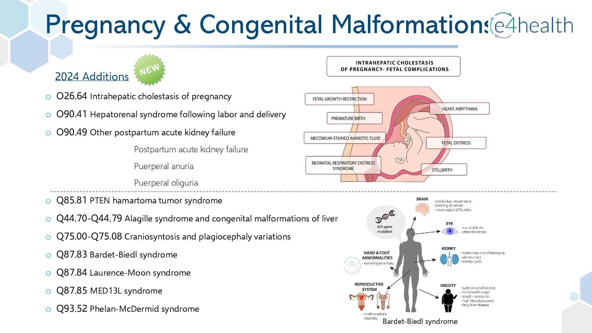 o O90.41 Hepatorenal syndrome following labor and delivery o O90.49 Other postpartum acute kidney failure Postpartum acute kidney failure Puerperal anuria Puerperal oliguria o Q85.81 PTEN hamartoma tumor syndrome o Q44.70-Q44.79 Alagille syndrome and congenital malformations of liver o Q75.00-Q75.08 Craniosyntosis and plagiocephaly variations o Q87.83 Bardet-Biedl syndrome o Q87.84 Laurence-Moon syndrome o Q87.85 MED13L syndrome o Q93.52 Phelan-McDermid syndrome 2024 Additions Bardet-Biedl syndrome