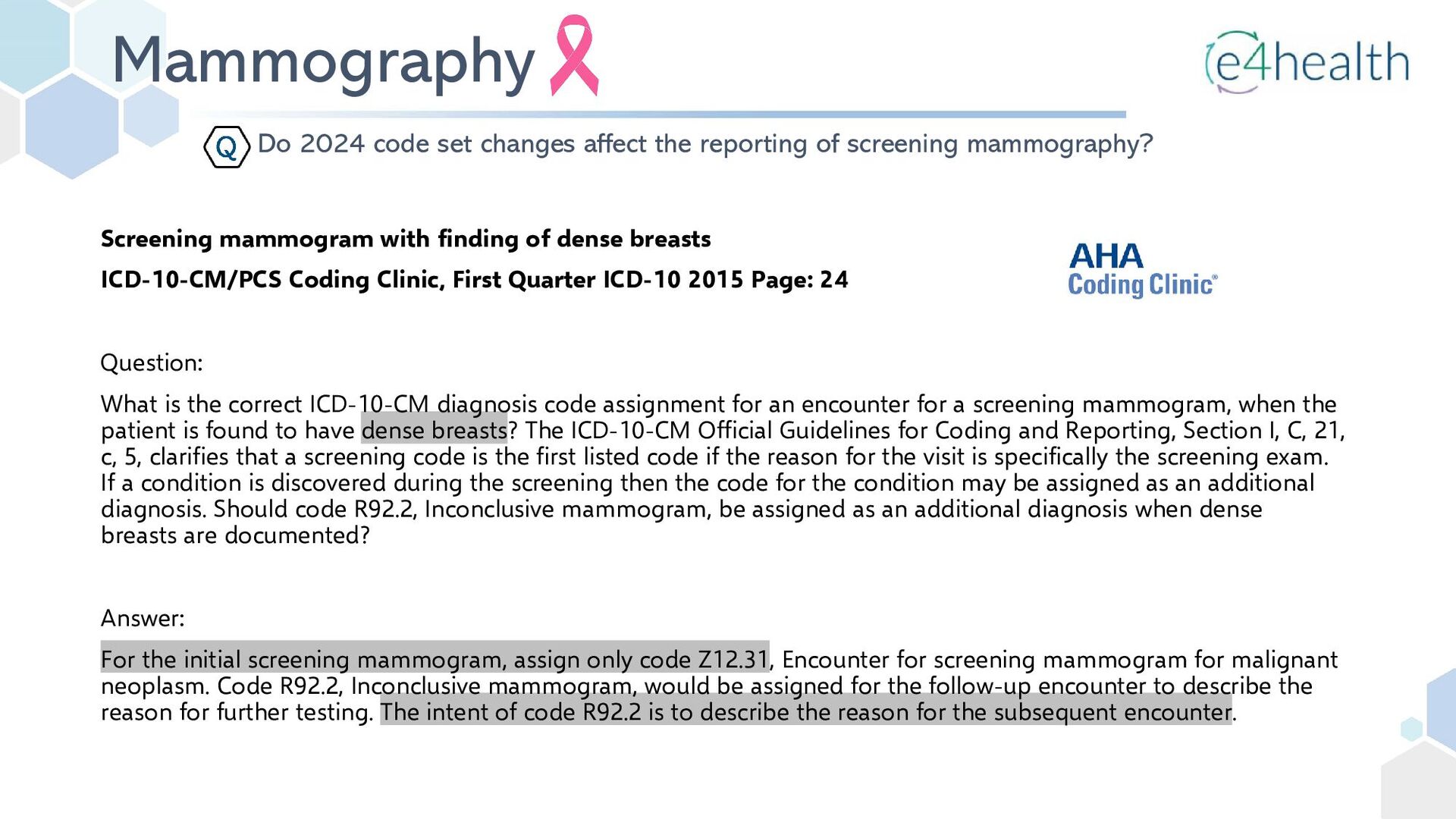 screening mammography? Screening mammogram with finding of dense breasts ICD-10-CM/PCS Coding Clinic, First Quarter ICD-10 2015 Page: 24 Question: What is the correct ICD-10-CM diagnosis code assignment for an encounter for a screening mammogram, when the patient is found to have dense breasts? The ICD-10-CM Official Guidelines for Coding and Reporting, Section I, C, 21, c, 5, clarifies that a screening code is the first listed code if the reason for the visit is specifically the screening exam. If a condition is discovered during the screening then the code for the condition may be assigned as an additional diagnosis. Should code R92.2, Inconclusive mammogram, be assigned as an additional diagnosis when dense breasts are documented? Answer: For the initial screening mammogram, assign only code Z12.31, Encounter for screening mammogram for malignant neoplasm. Code R92.2, Inconclusive mammogram, would be assigned for the follow-up encounter to describe the reason for further testing. The intent of code R92.2 is to describe the reason for the subsequent encounter.